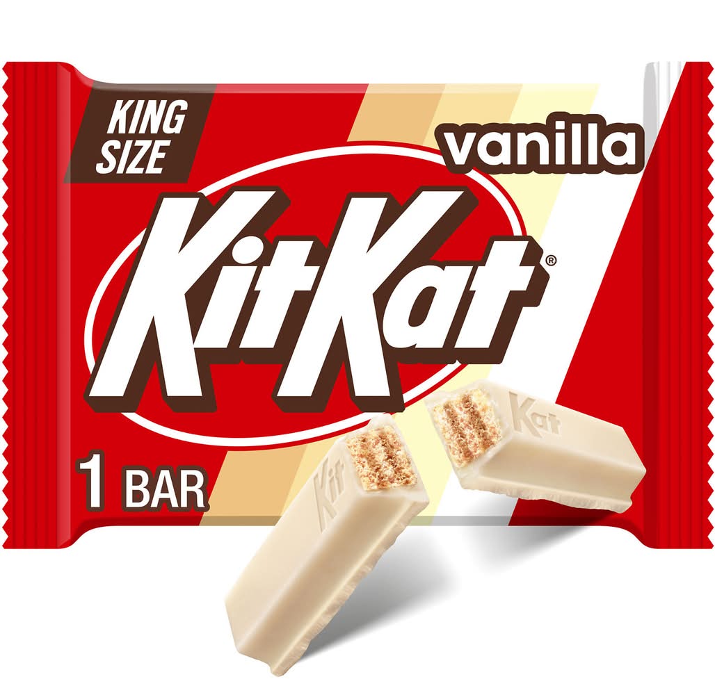 Ready for a delicious new flavor on a beloved classic treat? KIT KAT Vanilla Flavored wafer candy bars are perfect for enjoying throughout the summer. The vanilla flavored creme coating gives this classic wafer candy a twist that'll make your taste buds jump for joy. Indulge in a kosher certified, king size vanilla flavored KIT KAT wafer bar today by opening the wrapper and breaking off a piece to nibble on while running errands, at work or during your next adventure. You can also bring a bar with you wherever you go by slipping one into your lunch box or purse for when hunger strikes. KIT KAT candy also makes for a great afternoon pick-me-up or post-dinner treat. This perfectly sized bar means you don't have to worry about sharing (unless you want to). Crumble a few king size bars as toppings for ice cream sundaes and yogurt bowls or add some to your favorite cookie dough recipe or cake icing for a vanilla flavored creme twist. And don't forget about your holiday celebrations! Fill Easter baskets, Christmas stockings, Valentine's Day gift bags and Halloween candy bowls with KIT KAT Vanilla Flavored wafer candy. Just don't forget to save a few bars for yourself! • Brand: Kitkat • Flavor: Vanilla • kosher