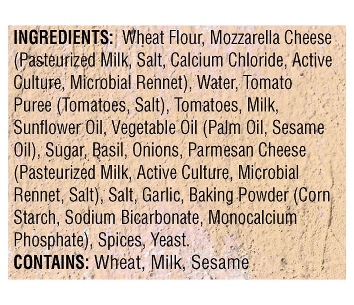 Ingredients: Wheat Flour, Mozzarella Cheese (Pasteurized Milk, Salt, Calcium Chloride, Active Culture, Microbial Rennet), Water, Tomato Puree (Tomatoes, Salt), Tomatoes, Milk, Sunflower Oil, Vegetable Oil (Palm Oil, Sesame Oil), Sugar, Basil, Onions, Parmesan Cheese (Pasteurized Milk, Active Culture, Microbial Rennet, Salt), Salt, Garlic, Baking Powder (Corn Starch, Sodium Bicarbonate, Monocalcium Phosphate), Spices, Yeast Contains: Milk, Wheat, Sesame