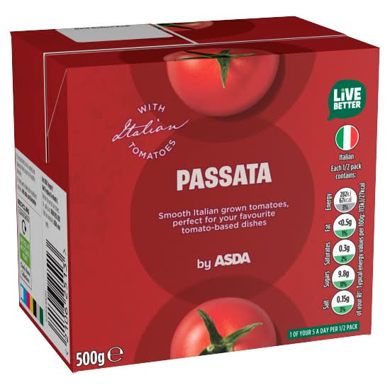Asda Passata Sieved Tomatoes offer a smooth texture, ideal for a variety of culinary applications. These tomatoes are cultivated in Italy and can contribute to one of the recommended five servings of fruits and vegetables per day when half a pack is consumed. • Asda, Leeds, LS11 5AD. • Packaging: Reusable