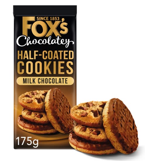 Cookies with Milk Chocolate Chunks Half Coated in Milk Chocolate. • Fox's Burton's Companies (FBC) UK, Wellington Street, Batley, West Yorkshire, WF17 5JE. • Packaging: Reusable