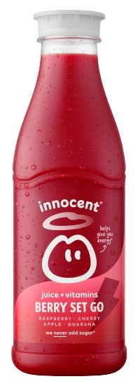 A Blend of Fruit & Vegetable Juices with Guarana Infusion + Added Vitamins. Extra burst of goodness. Looking after your innocent plus. Pasteurised. • Flavor: Berry set go • Fruit Towers, 342 Ladbroke Grove, London, W10 5BU. • Packaging: Reusable