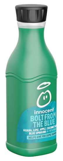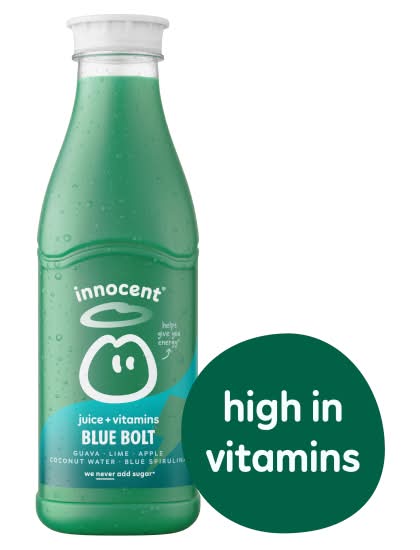 innocent Plus Blue Bolt Guava & Lime Juice is a blend of fruit, coconut water, spirulina extract and added vitamins, for that extra burst of goodness. No added sugar. This juice is high in vitamins B1, B2, B3 and B6 which can contribute to normal energy yielding metabolism, and vitamin C which can help reduce tiredness and fatigue. It includes 4 1/2 pressed apples 66%, coconut water 18%, 15 pressed grapes, some crushed white guava 5%, a dash of pressed passion fruit, , a dash of spirulina extract 0.8%, a squeeze of lime 0.7%, and some vitamins B1, B2, B3, B6 & D4. Suitable for vegans and pasteurised. Keep refrigerated 0-8°C before and after opening. Once opened, drink within 4 days. The bottle is 100% recyclable, so please recycle when you're finished. We use partly recycled and fully recyclable bottles, refuse to air freight and source ethically. 10% of profits go to good causes Contains naturally occurring sugars from fruit & veg. • Flavor: Blue bolt • Fruit Towers, 342 Ladbroke Grove, London, W10 5BU.