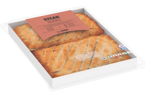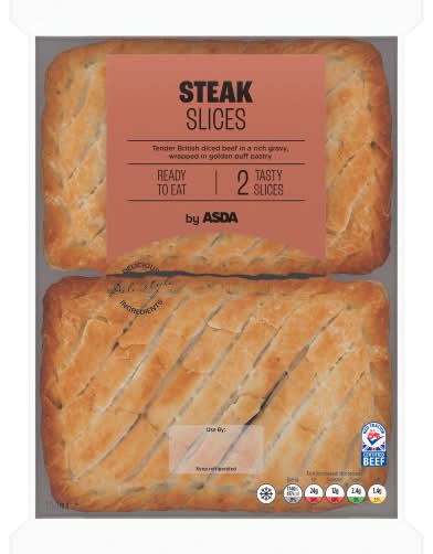 Asda Steak Slices feature diced British beef and onion enveloped in a rich gravy, all contained within a golden puff pastry. These slices can be enjoyed either hot or cold and are free from artificial colors, flavors, and hydrogenated fat. • Asda, Asda, Leeds, LS11 5AD. • Packaging: Reusable