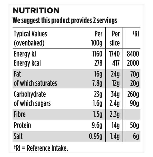 Directions for use: Oven cook - From Chilled. Ready to eat. This product may be served hot or cold. For best results heat from chilled. 180°C / 350°F / Fan 160°C / Gas 4 / 20 Mins. Remove all packaging. Preheat oven and place slices onto a baking tray on the middle shelf. Check product is piping hot before serving. Do not reheat. We have given you these heating instructions as a guide only. Suitable for Home Freezing. Keep Refrigerated. Ready to Eat. Storage recommendation: Chilled. Keep refrigerated. Suitable for freezing. Freeze on day of purchase and consume within 1 month. Defrost thoroughly before use. Once defrosted, consume within 24 hours, do not refreeze.