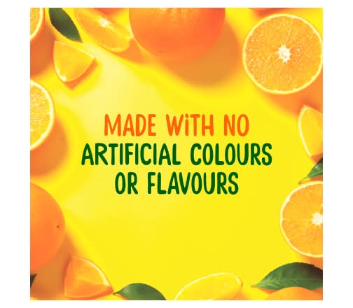 Ingredients: Water, orange juice from concentrate (20%), glucose syrup, sugar, apple juice from concentrate (6%), fructose, soluble corn fibre, acidity regulator (citric acid), stabilisers (guar gum, locust bean gum, tara gum), colours (paprika extract, curcumin), natural orange flavouring. May contain: MILK. Gluten free Contains: Milk