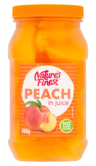 Nature's Finest Peach in Juice offers a 700g serving of peaches immersed in their natural juice. These peaches come without any added sugar, though they contain sugars that occur naturally within the fruit itself. • Nature's Finest Food Products Ltd, The Switch,1-7 The Grove,Slough,Berkshire,SL1 1QP. • Packaging: Reusable