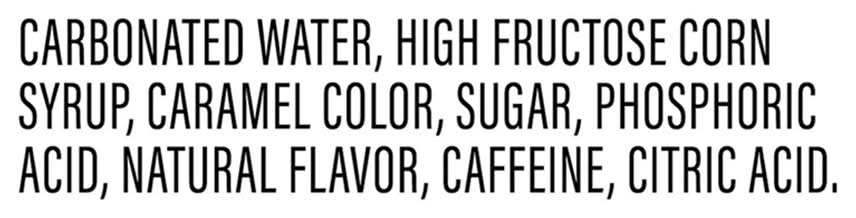 Ingredients: Carbonated Water, High Fructose Corn, Syrup, Caramel Color, Sugar, Phosphoric Acid, Natural Flavor, Caffeine, Citric Acid Contains: Corn Contains 50mg of caffeine