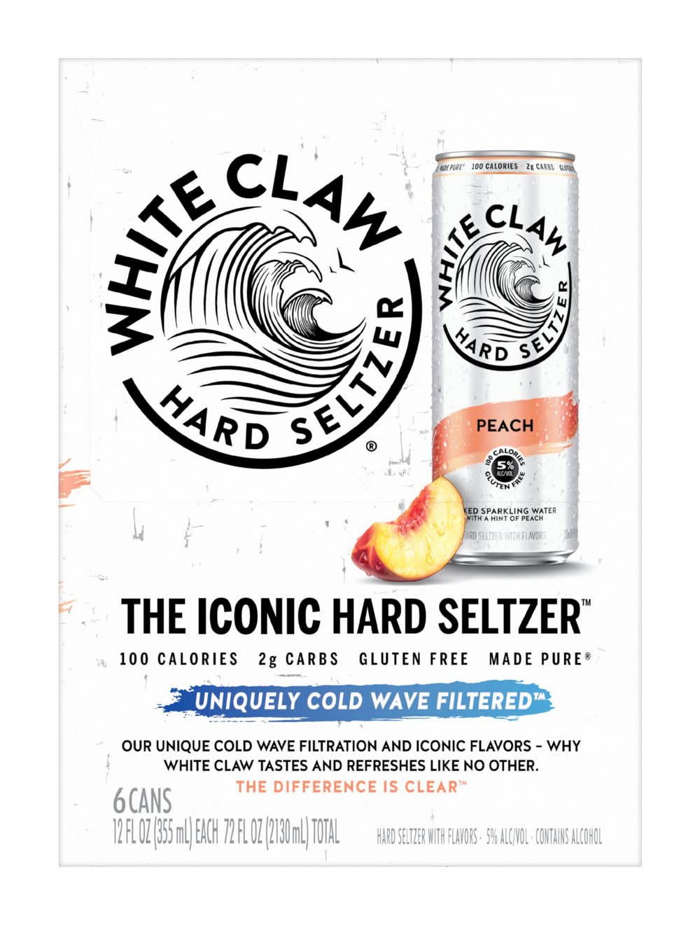 Discover a wave of pure, crisp taste refreshment with a 6-Pack of White Claw Hard Seltzer Peach. Each sip brings a wave of fresh peach flavor, juicy and sweet with a crisp finish that brings you back for more. Crafted with quality ingredients, White Claw Peach is made from a blend of seltzer water, gluten-free alcohol, and a hint of peach flavor. • Brand: White claw • Flavor: Peach • Pack size: 6 • gluten-free • Alcohol by volume: 5%