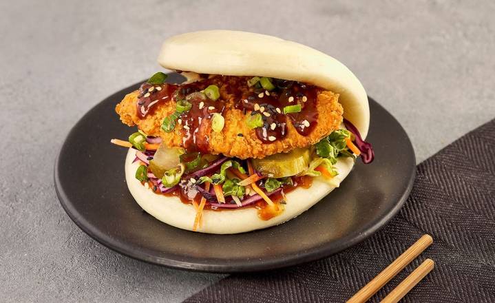 Deep fried crispy chicken, asian slaw, korean bbq sauce, pickle, spring onions and garnish
