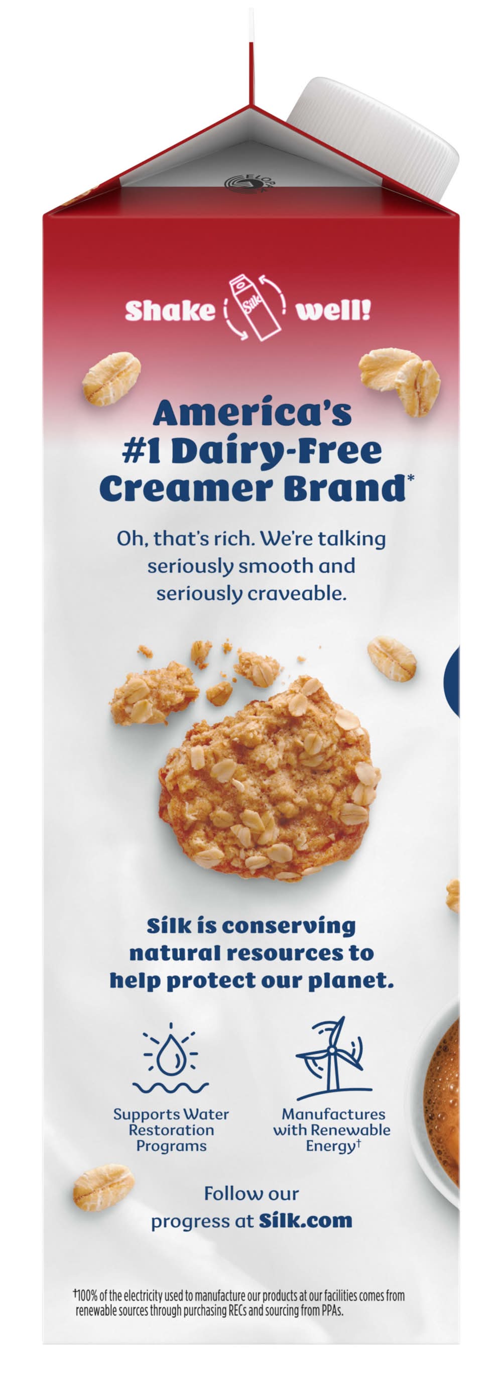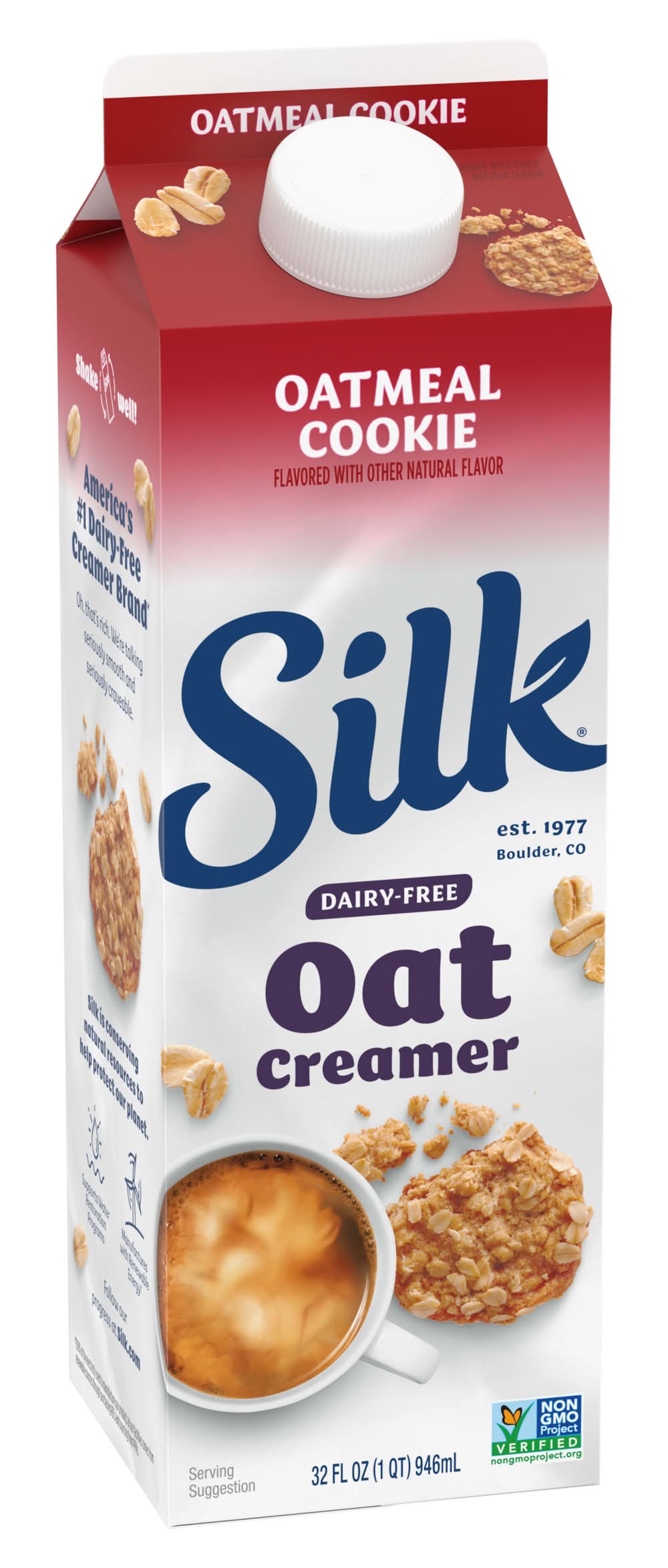Make your days more flavorful with Silk Oatmeal Cookie Oat Creamer. Not your average coffee creamer, this smooth and lusciously creamy dairy free oatmeal cookie creamer is a great way to start your day. Silk oat creamer is free of dairy, lactose, carrageenan, gluten and cholesterol, making it a great choice for any lifestyle. Plus, there are no artificial colors or flavors in this lactose free creamer. Make a “me” moment by adding a splash of this oatmeal cookie flavored vegan creamer to smoothies, shakes, your morning coffee or anything that could use a smooth and creamy oat boost. At Silk, we believe in the power of plants to do a world of good, so people can enjoy good, feel good and do good. Silk gluten free, non dairy creamer is the #1 brand of plant based creamers. It’s also Non-GMO Project Verified. Level up your coffee experience with Silk Oat Creamer. Leading brand based on national sales data. • Danone US, LLC, Broomfield, CO, 80021 • Packaging: Reusable