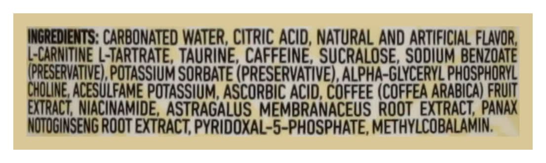 Ingredients: Carbonated Water, Citric Acid, Natural Flavor, L-Carnitine L-Tartrate, Taurine, Caffeine, Sucralose, Sodium Benzoate (Preservative), Potassium Sorbate (Preservative), Alpha-Glyceryl Phosphoryl Choline, Acesulfame Potassium, Ascorbic Acid, Coffee (Coffea Arabica) Fruit Extract, Niacinamide, Astragalus Membranaceus Root Extract, Panax Notoginseng Root Extract, Pyridoxal-5-Phosphate, Methylcobalamin Contains: Milk