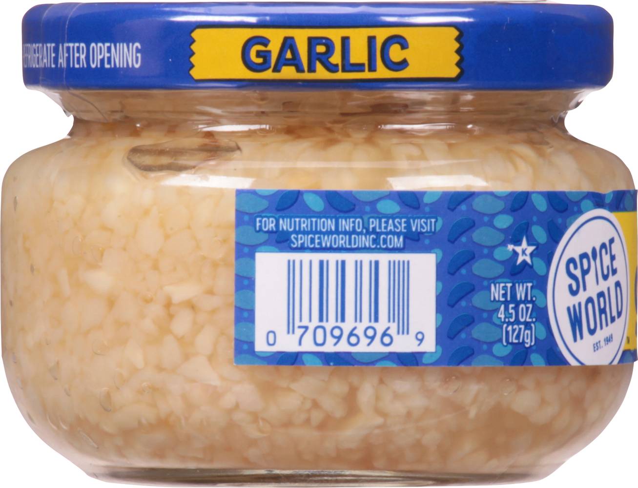 Spice World Minced Garlic offers a bold savory flavor, using non-GMO ingredients. Established in 1949, the product simplifies culinary preparation by equating 1 teaspoon to approximately 1 clove of garlic. It comes ready to use, adding convenience to cooking and seasoning. Flavor: Bold savory