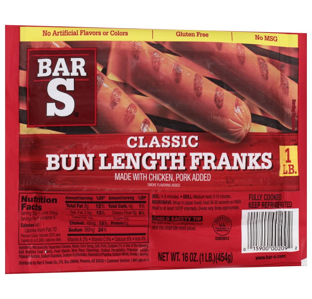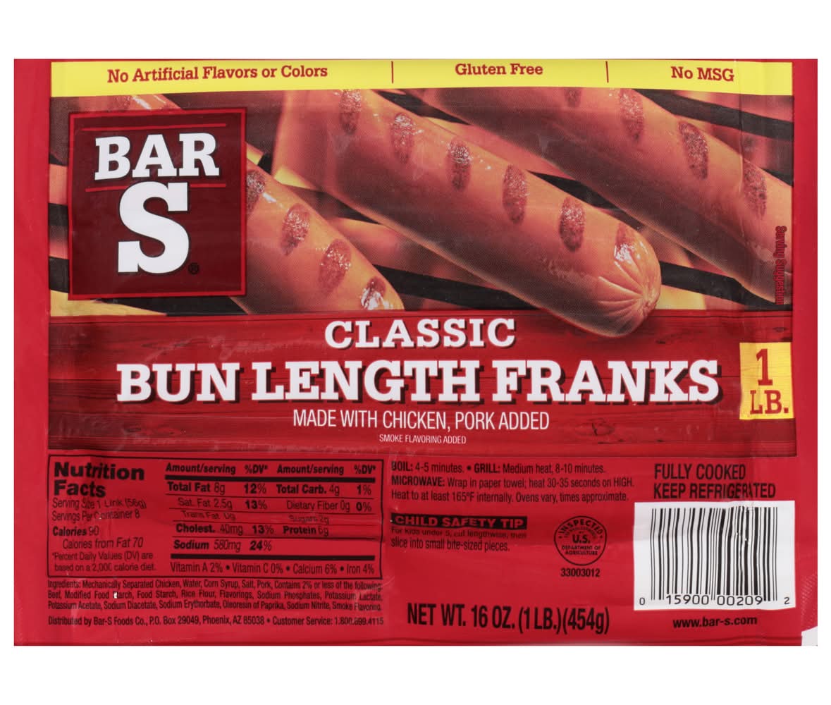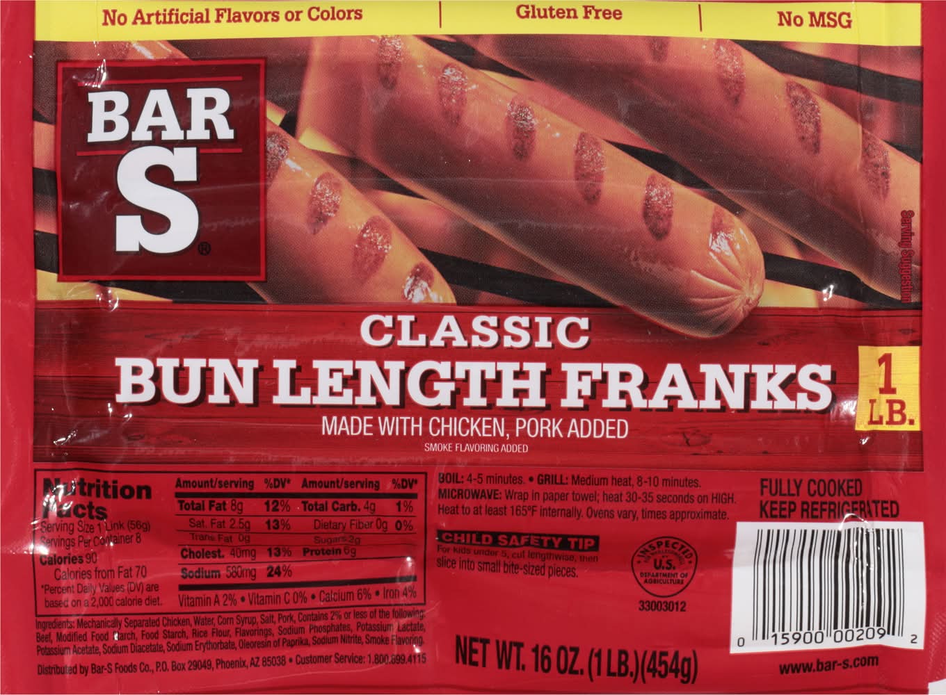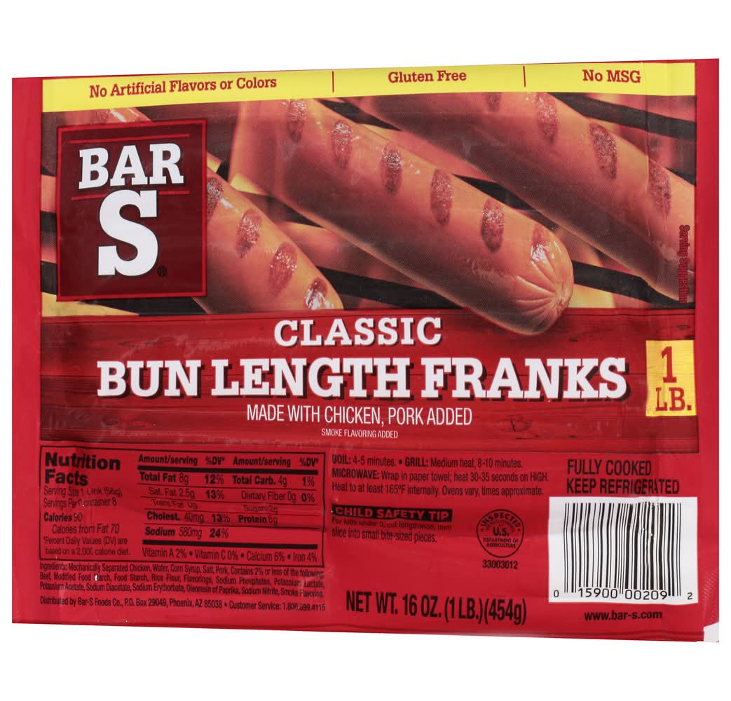 Bar-S Classic Bun Length Franks Hot Dogs, Chicken and Pork (16 oz)