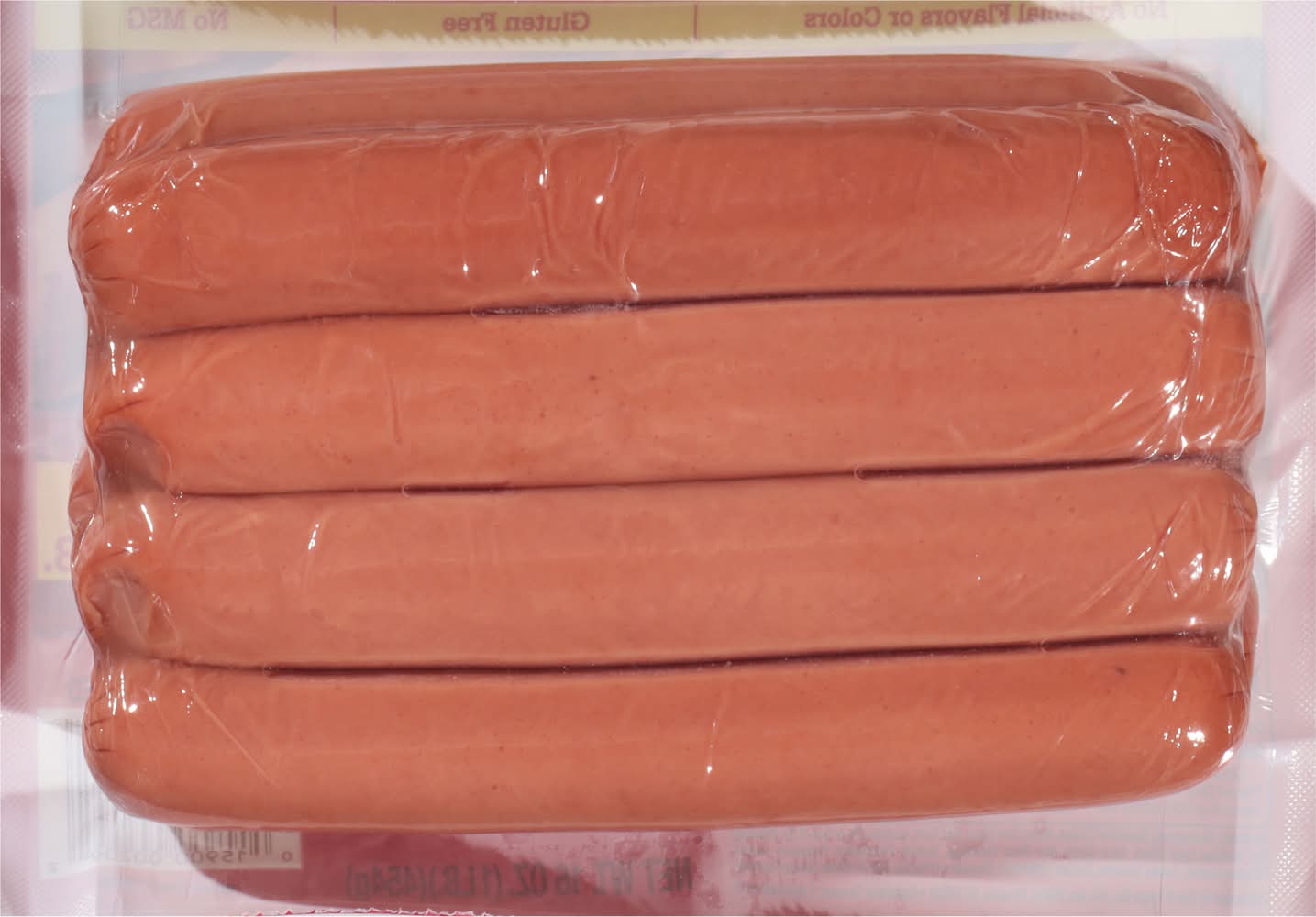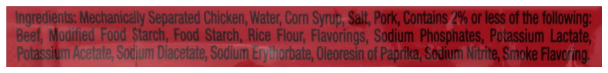 Ingredients: Mechanically Separated Chicken, Water, Corn Syrup, Salt, Pork, Contains 2% or Less of the Following: Beef, Modified Food Starch, Food Starch, Rice Flour, Flavorings, Sodium Phosphates, Potassium Lactate, Potassium Acetate, Sodium Diacetate, Sodium Erythorbate, Oleoresin of Paprika, Sodium Nitrite, Smoke Flavoring