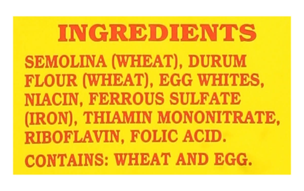 Ingredients: Semolina (Wheat), Durum Flour (Wheat), Wheat Flour, Egg Whites, Niacin, Ferrous Sulfate (Iron), Thiamin Mononitrate, Riboflavin, Folic Acid Contains: Wheat, Eggs