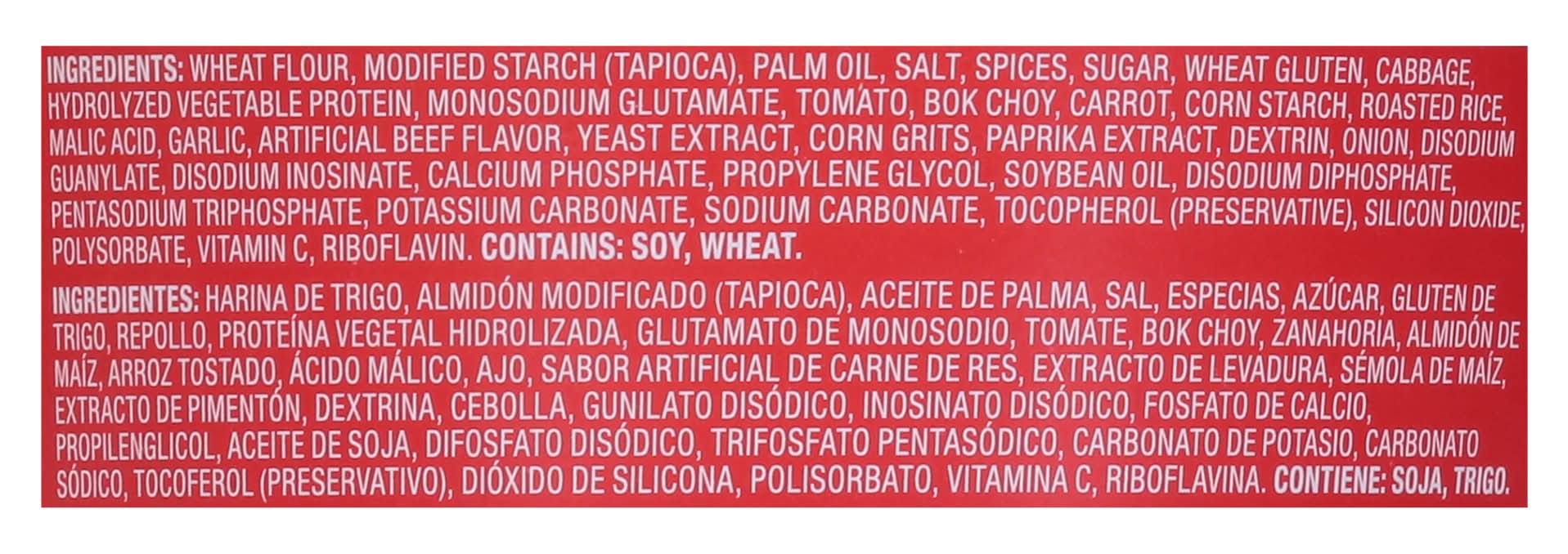 Ingredients: Wheat Flour, Modified Starch (Tapioca), Palm Oil, Salt, Spices, Sugar, Wheat Gluten, Cabbage, Hydrolyzed Vegetable Protein, Monosodium Glutamate, Tomato, Bok Choy, Carrot, Corn Starch, Roasted Rice, Malic Acid, Garlic, Artificial Beef Flavor, Yeast Extract, Corn Grits, Paprika Extract, Dextrin, Onion, Disodium Guanylate, Disodium Inosinate, Calcium Phosphate, Propylene Glycol, Soybean Oil, Disodium Diphosphate, Pentasodium Triphosphate, Potassium Carbonate, Sodium Carbonate, Tocopherol (Preservative), Silicon Dioxide, Polysorbate, Vitamin C, Riboflavin Contains: Wheat, Soybeans, Eggs, Milk, Fish, Crustacean Shellfish, Tree Nuts, Peanuts, Soybeans