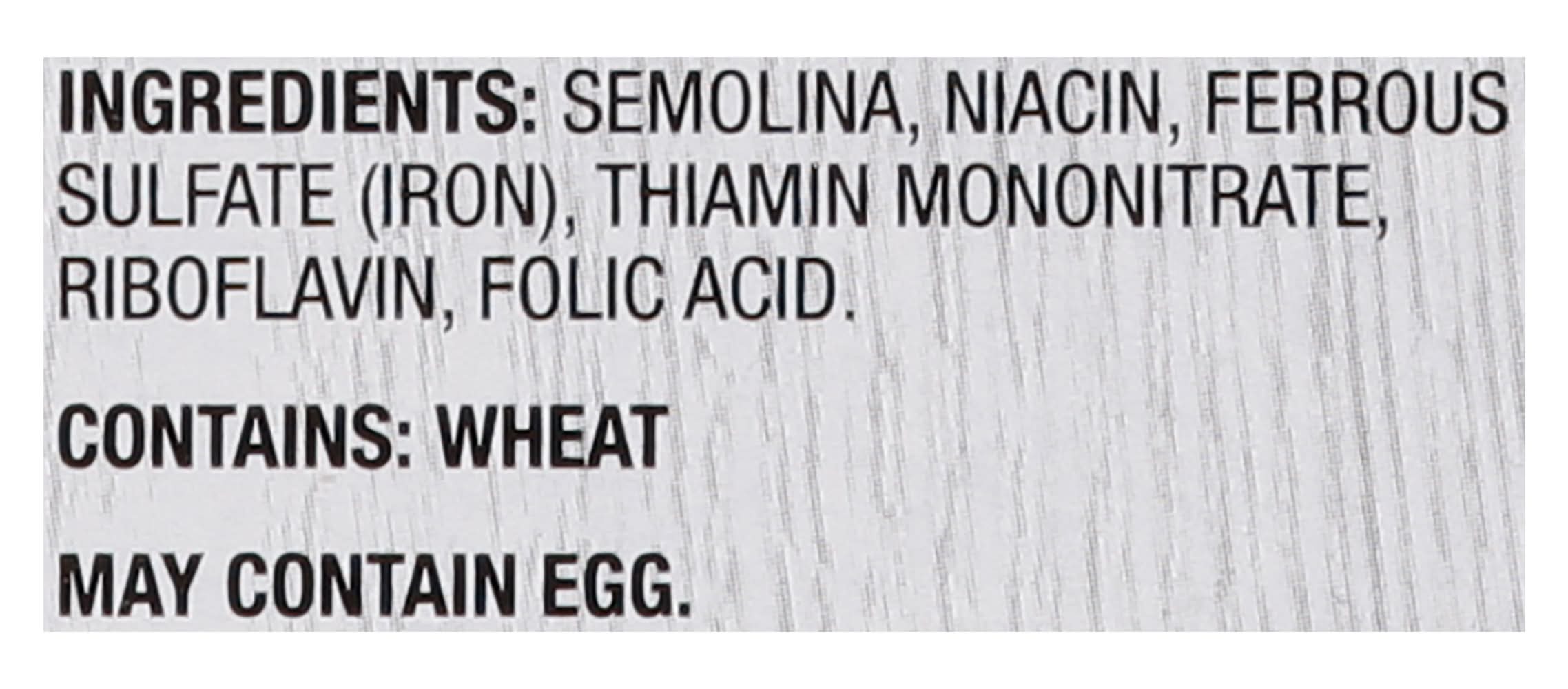 Ingredients: Semolina, Niacin, Ferrous Sulfate (Iron), Thiamin Mononitrate, Riboflavin, Folic Acid Contains: Wheat, Eggs