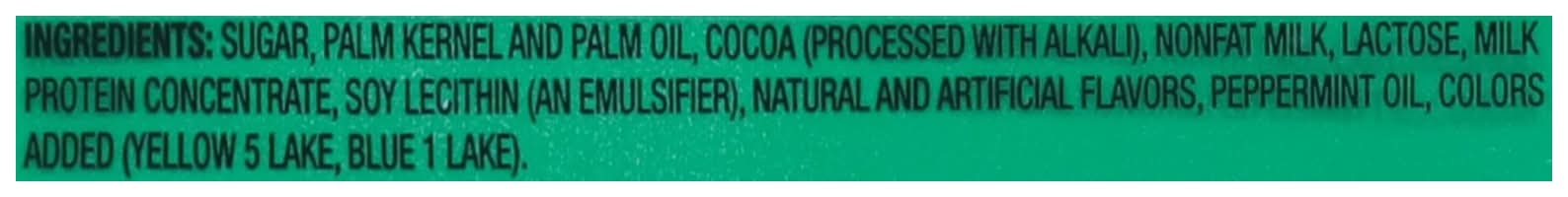 Ingredients: Sugar, Palm Kernel and Palm Oil, Cocoa (Processed with Alkali), Nonfat Milk, Lactose, Milk Protein Concentrate, Soy Lecithin (an Emulsifier), Natural and Artificial Flavors, Peppermint Oil, Colors Added (Yellow 5 Lake, Blue 1 Lake). Contains: Milk, Lactose, Soybeans