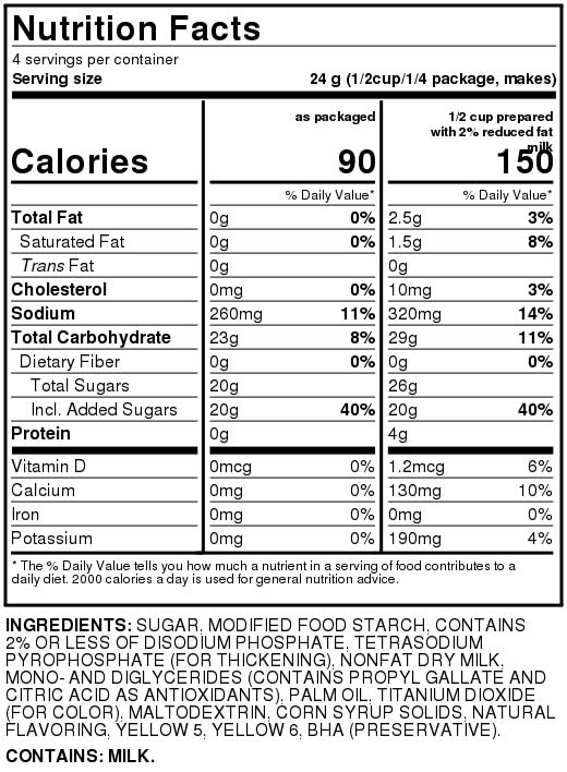 Ingredients: SUGAR, MODIFIED FOOD STARCH, CONTAINS 2% OR LESS OF DISODIUM PHOSPHATE, TETRASODIUM PYROPHOSPHATE (FOR THICKENING), NONFAT DRY MILK, MONO- AND DIGLYCERIDES (CONTAINS PROPYL GALLATE AND CITRIC ACID AS ANTIOXIDANTS), PALM OIL, TITANIUM DIOXIDE (FOR COLOR), MALTODEXTRIN, CORN SYRUP SOLIDS, NATURAL FLAVORING, YELLOW 5, YELLOW 6, BHA (PRESERVATIVE) Contains: Milk