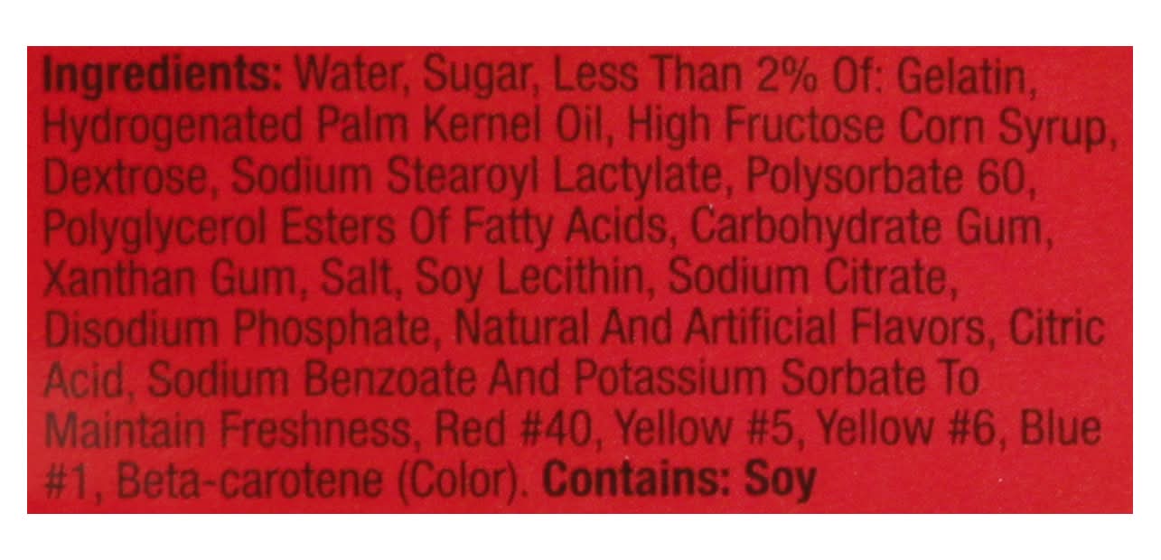 Ingredients: Water, Sugar, Less than 2% of: Gelatin, Hydrogenated Palm Kernel Oil, High Fructose Corn Syrup, Dextrose, Sodium Stearoyl Lactylate, Polysorbate 60, Polyglycerol Esters of Fatty Acids, Carbohydrate Gum, Xanthan Gum, Salt, Soy Lecithin, Sodium Citrate, Disodium Phosphate, Natural and Artificial Flavors, Citric Acid, Sodium Benzoate and Potassium Sorbate to Maintain Freshness, Red 40, Yellow 5, Yellow 6, Blue 1, Beta-Carotene (Color) Contains: Soybeans