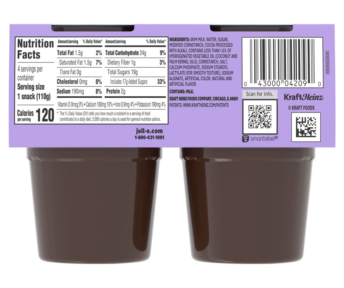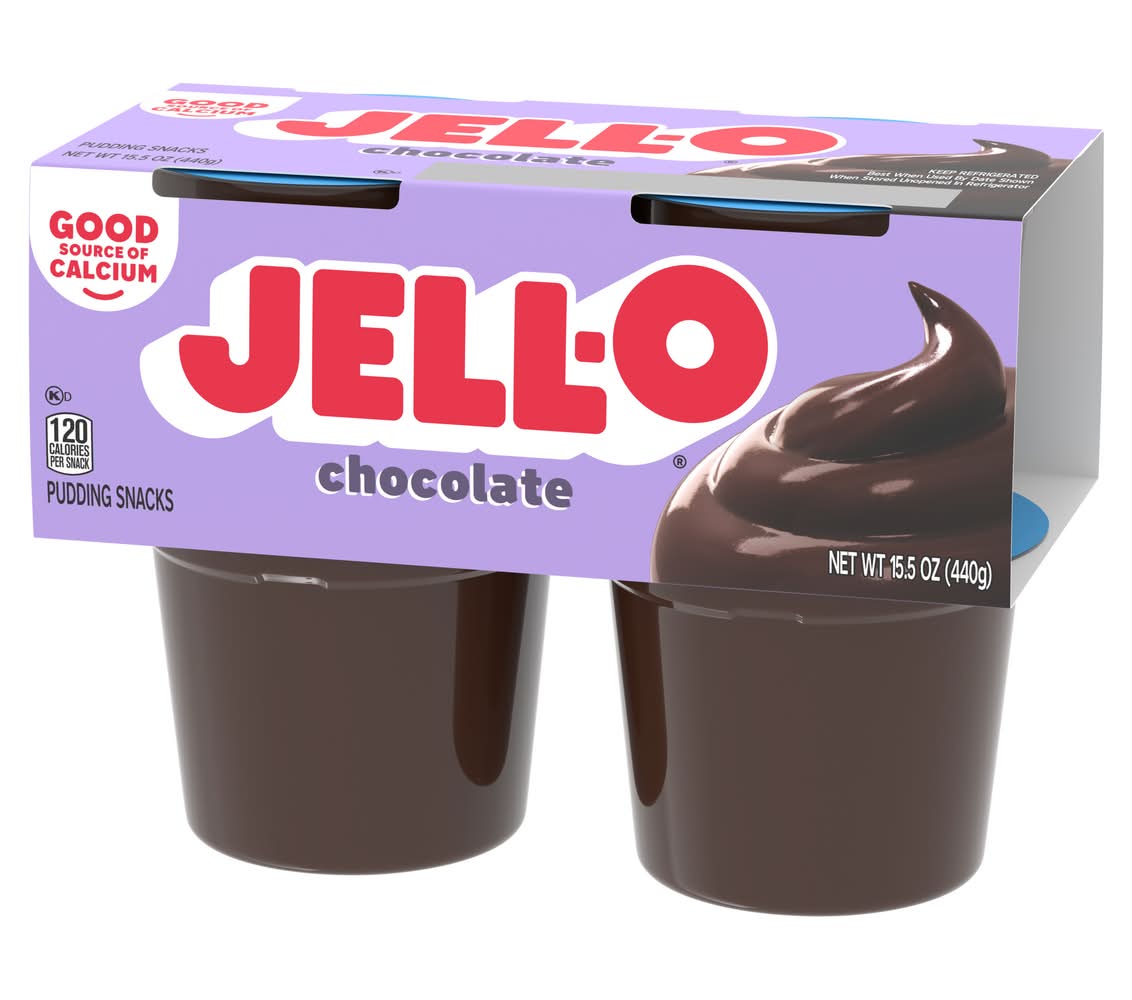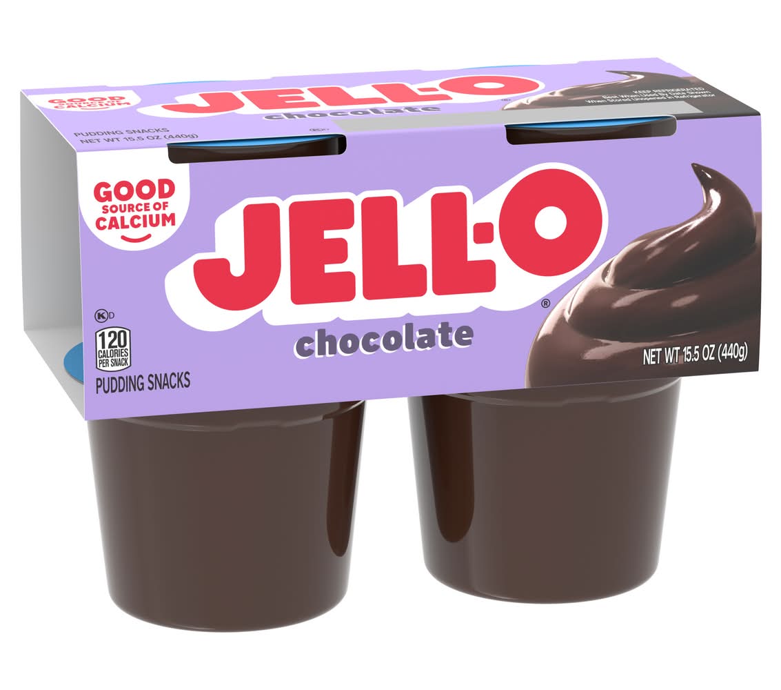 Snack happy. Jell-O Original Chocolate Ready-to-Eat Pudding Snack Cups are a delicious, ready-to-eat, on-the-go snack. Enjoy pudding fun in every bite with our individual snack cups that are perfect for packing in a lunchbox, eating on the go or snacking at home. Add some wonder to your day with a delicious, convenient snack. Made with milk, our chocolate pudding cups are a good source of calcium. Each pudding snack contains 120 calories per serving. Each 15.5-ounce sleeve contains four chocolate pudding cups for quick and easy snacking. Spoon up a smile with Jell-O Original Chocolate Ready-to-Eat Pudding Cups. • Flavor: Chocolate • Kraft Heinz Foods Company, Chicago ,IL, 60601
