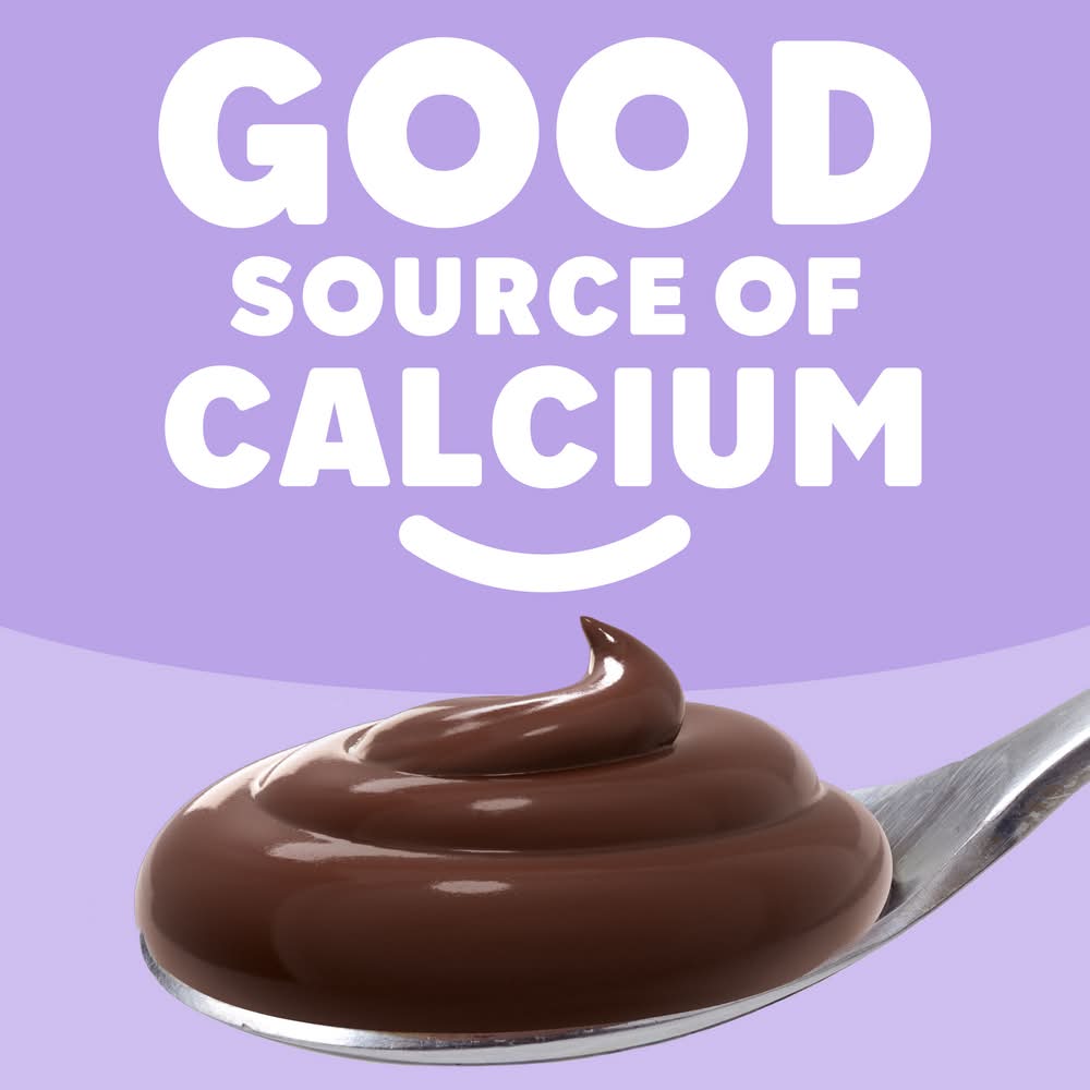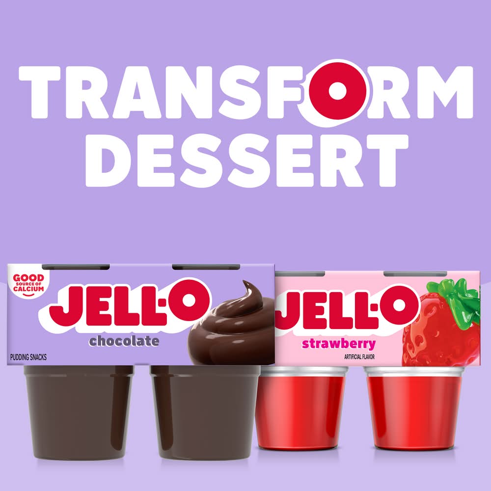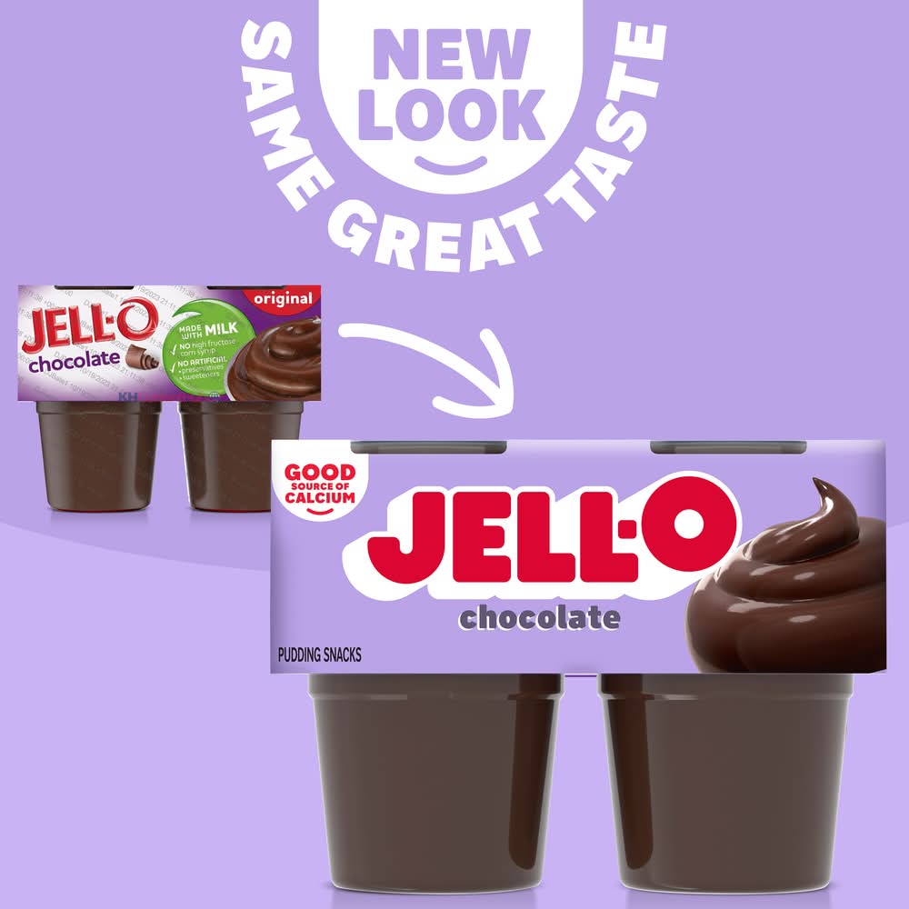 Snack happy. Jell-O Original Chocolate Ready-to-Eat Pudding Snack Cups are a delicious, ready-to-eat, on-the-go snack. Enjoy pudding fun in every bite with our individual snack cups that are perfect for packing in a lunchbox, eating on the go or snacking at home. Add some wonder to your day with a delicious, convenient snack. Made with milk, our chocolate pudding cups are a good source of calcium. Each pudding snack contains 120 calories per serving. Each 15.5-ounce sleeve contains four chocolate pudding cups for quick and easy snacking. Spoon up a smile with Jell-O Original Chocolate Ready-to-Eat Pudding Cups. • Flavor: Chocolate • Kraft Heinz Foods Company, Chicago ,IL, 60601