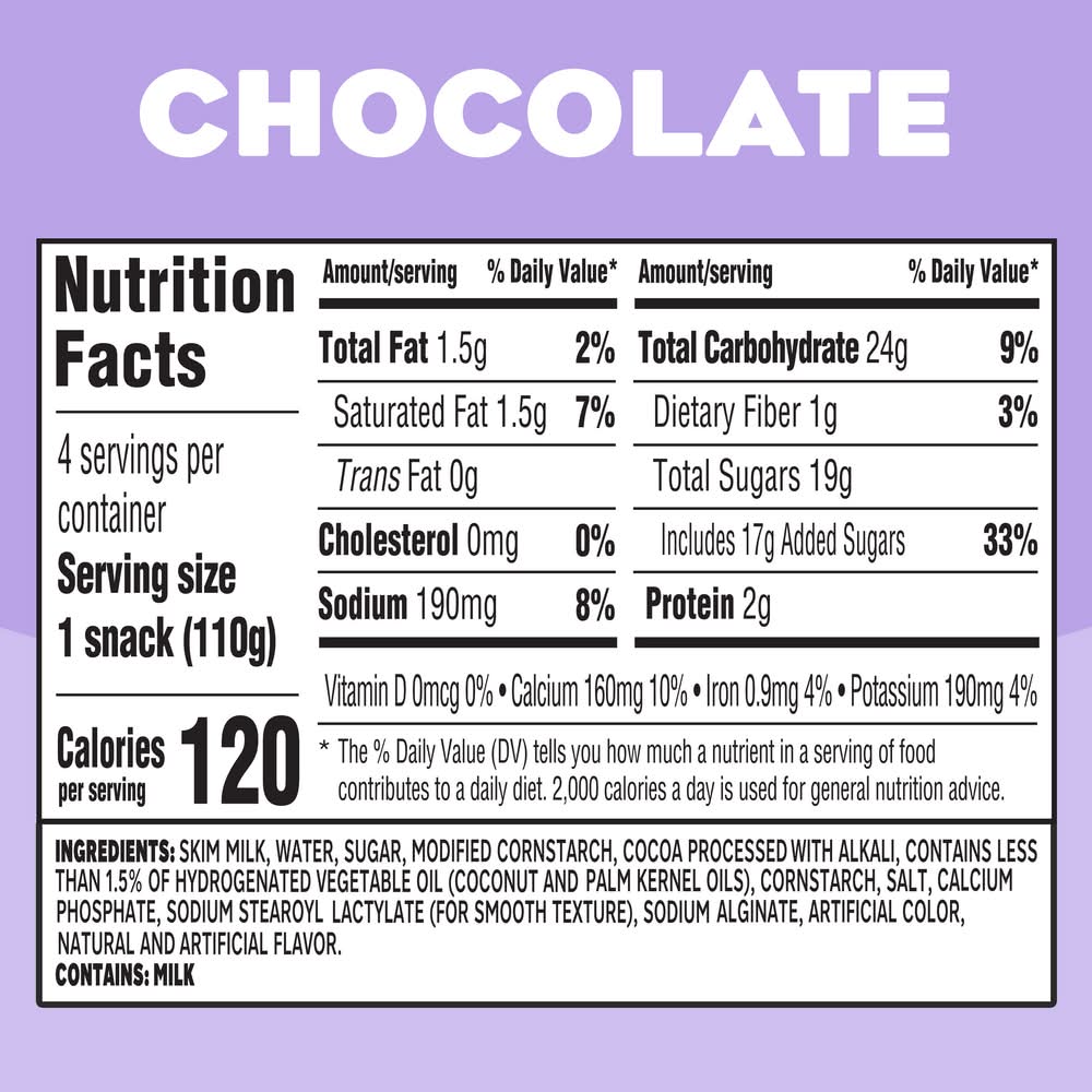 Ingredients: SKIM MILK, WATER, SUGAR, MODIFIED CORNSTARCH, COCOA PROCESSED WITH ALKALI, CONTAINS LESS THAN 1.5% OF HYDROGENATED VEGETABLE OIL (COCONUT AND PALM KERNEL OILS), CORNSTARCH, SALT, CALCIUM PHOSPHATE, SODIUM STEAROYL LACTYLATE (FOR SMOOTH TEXTURE), SODIUM ALGINATE, ARTIFICIAL COLOR, NATURAL AND ARTIFICIAL FLAVOR, VITAMIN A PALMITATE, VITAMIN D. Contains: Milk