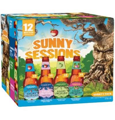 Angry Orchard Hard Cider Sunny Sessions Seasonal Variety Pack includes a selection of four flavors: Crisp Apple, Green Apple, Tropical Fruit, and the limited-edition Blueberry Rose, which is crafted with real blueberry juice. Each flavor provides a unique taste experience, from classic tartness to tropical notes. The product is gluten-free and has an alcohol by volume of 5%. It is offered in a package of twelve 12-ounce bottles and is available from March through August. • Brand: Angry orchard • Pack size: 12 • gluten-free • Alcohol by volume: 5% • Tasting notes: apple, bright, cherry, crisp, fruity, smooth, sour, sweet, vanilla • Food pairing: dessert - fruit
