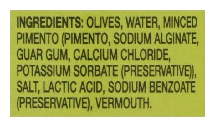 Ingredients: Olives, Water, Minced Pimento (Pimento, Sodium Alginate, Guar Gum, Calcium Chloride, Potassium Sorbate (Preservative), Salt, Lactic Acid, Sodium Benzoate (Preservative), Vermouth