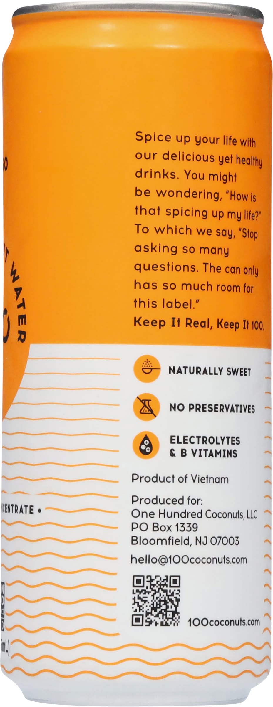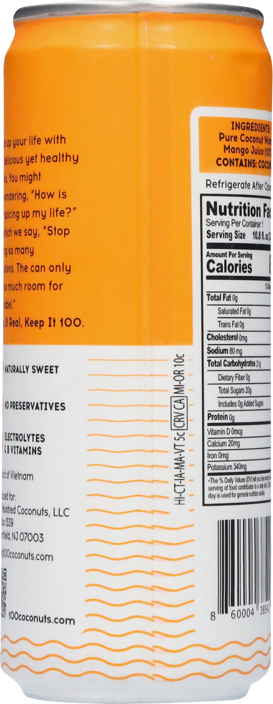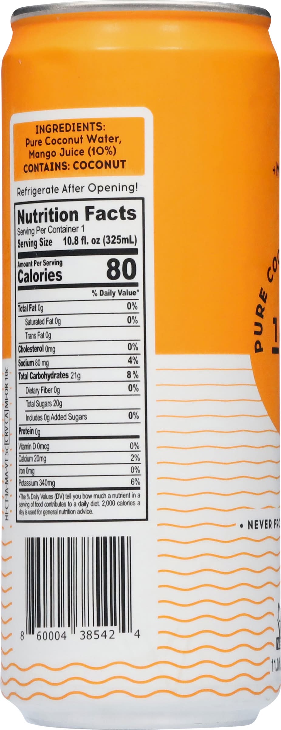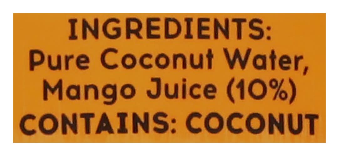 Ingredients: Pure Coconut Water, Mango Juice (10%) Contains: Tree Nuts, Coconuts