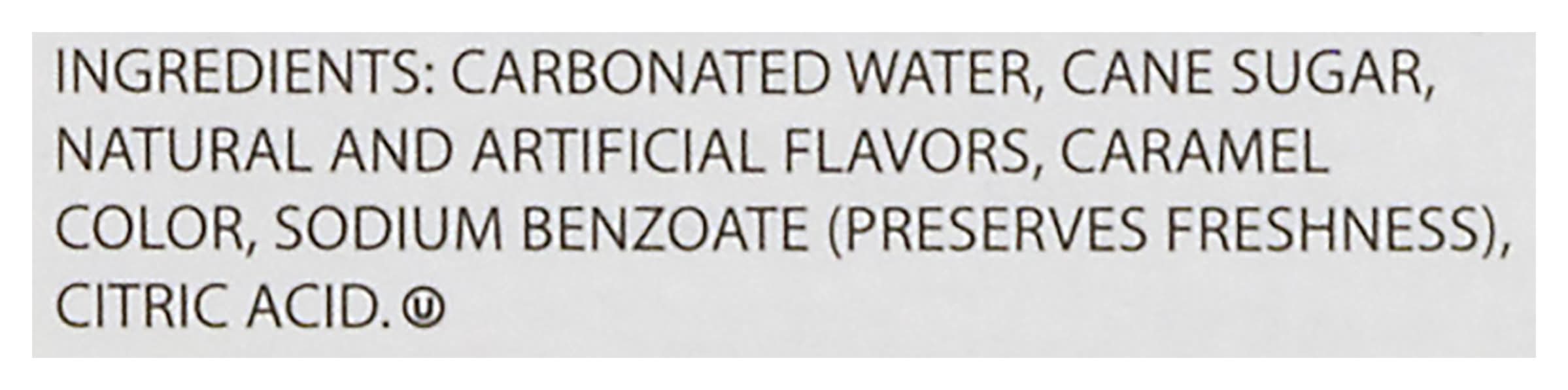 Ingredients: Carbonated Water, Cane Sugar, Natural and Artificial Flavors, Caramel Color, Sodium Benzoate (Preserves Freshness), Citric Acid