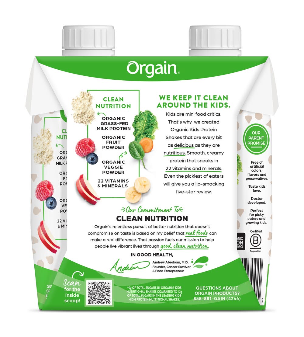 Raising the monkey bars on taste. When it comes to wholesome ingredients, we don’t monkey around. Here at Orgain, our Kids Organic Nutritional Shakes give kiddos the delicious taste they want with the nutrition they need, including 8 grams of Organic grass-fed milk protein, 22 vitamins and minerals and never any artificial colors, flavors, preservatives or sweeteners. The sky is the limit with our SuperGrow Protein, a unique organic, complete protein that contains all nine essential amino acids. This barrel of fun is crafted to be smooth and utterly creamy with kid-friendly flavors like Chocolate, Vanilla and Strawberry that even the pickiest of eaters will love. Our shakes have 25% less sugar vs other leading kids' high protein nutrition shakes, so you can feel good about what you put into your kid’s body. Not to mention, because it’s from Orgain, everything is as clean as it gets, meaning each serving of Kids Organic Nutritional Shakes includes 10 Organic fruits & veggie powders and supports the immune system with vitamins including Vitamins B12, C, D & Zinc. These shakes are perfect for those hectic, on the go mornings, or as quick snacks to fuel up before and after activities. Good, clean, and all-in-one nutrition ready for you to take on the go, whenever and wherever you need it. So, what are you waiting for? Time to get your shake on! vs. the leading Kids High Protein Nutritional Shake. 9g of total sugar in Orgain Kid’s Nutritional Shakes compared to 12g of total sugars in the leading Kid’s High Protein Nutritional Shakes. • Flavor: Chocolate • Pack size: 4