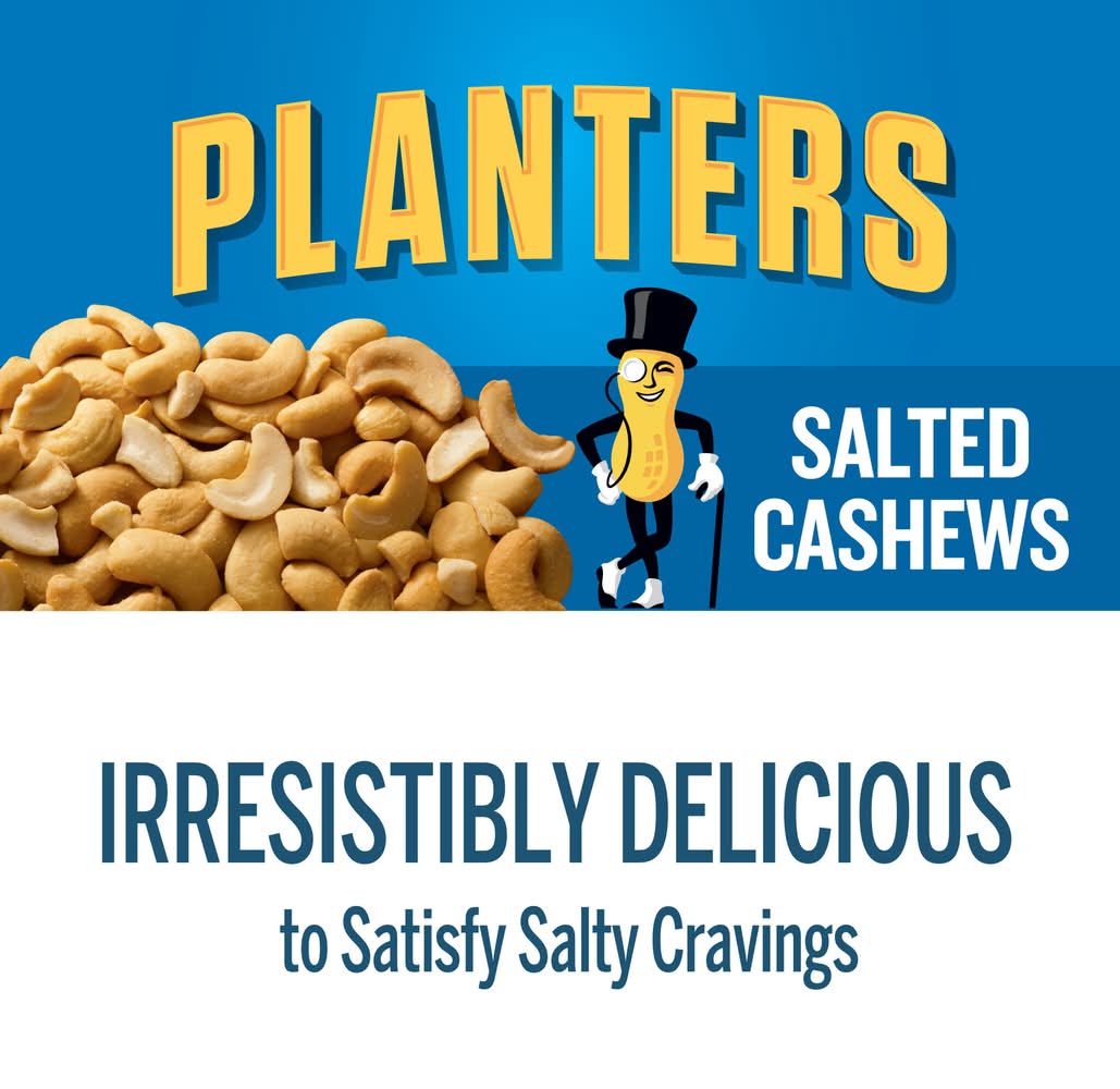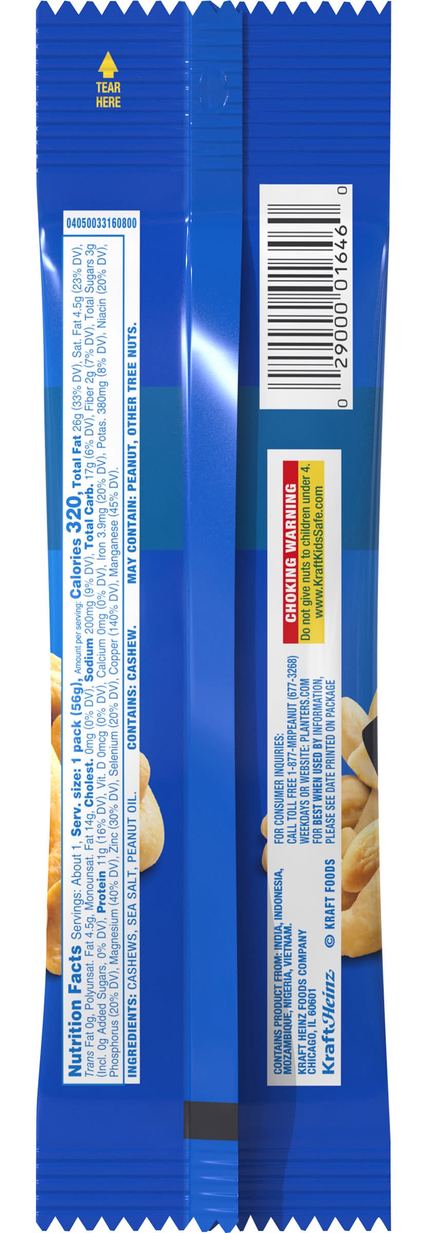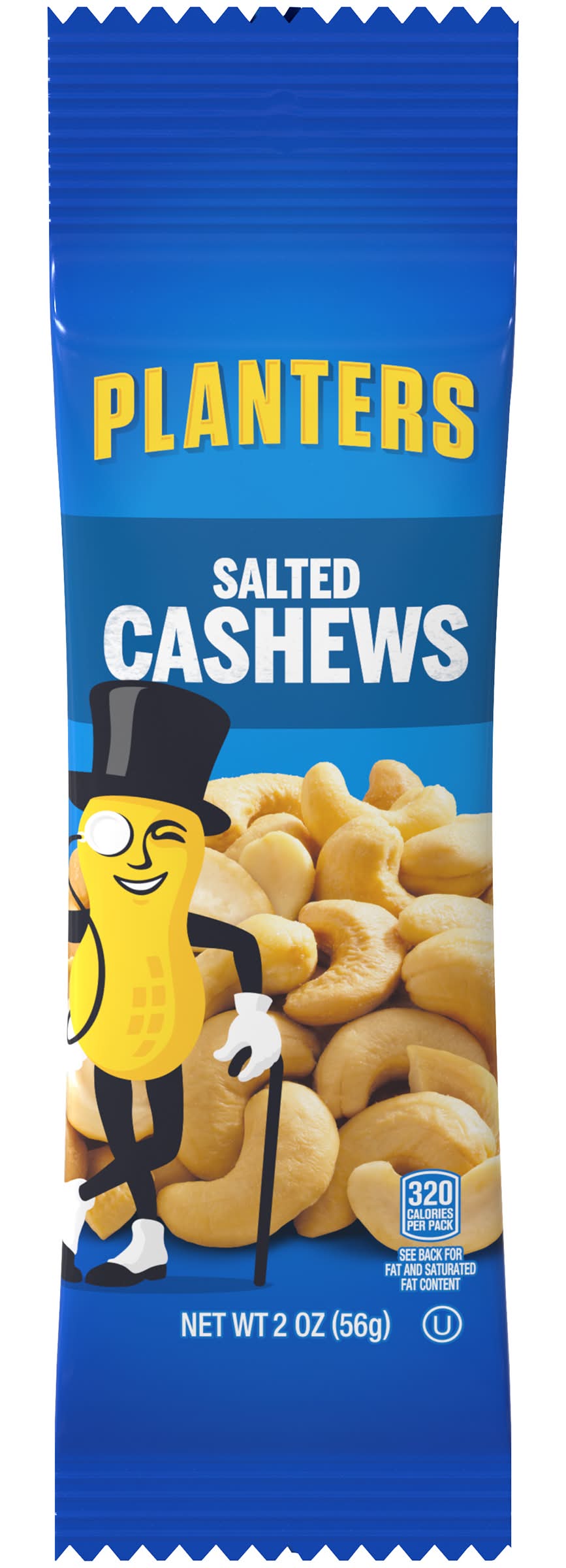 Planters Salted Cashews come in a convenient 2oz bag, containing cashews sourced from Brazil, India, Ivory Coast, Nigeria, and Vietnam. Each pack provides 320 calories, and detailed nutritional information regarding fat and saturated fat content is available on the back panel of the packaging.