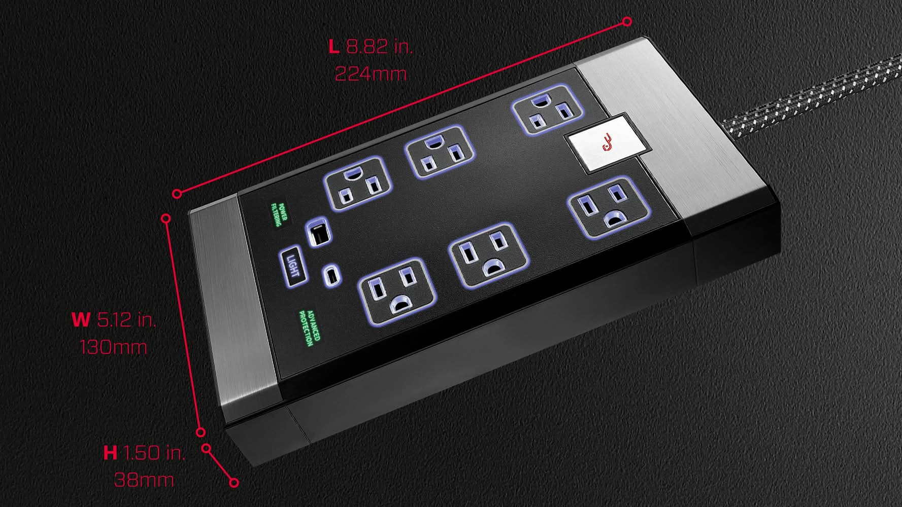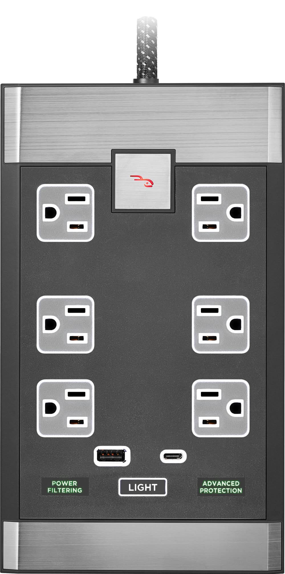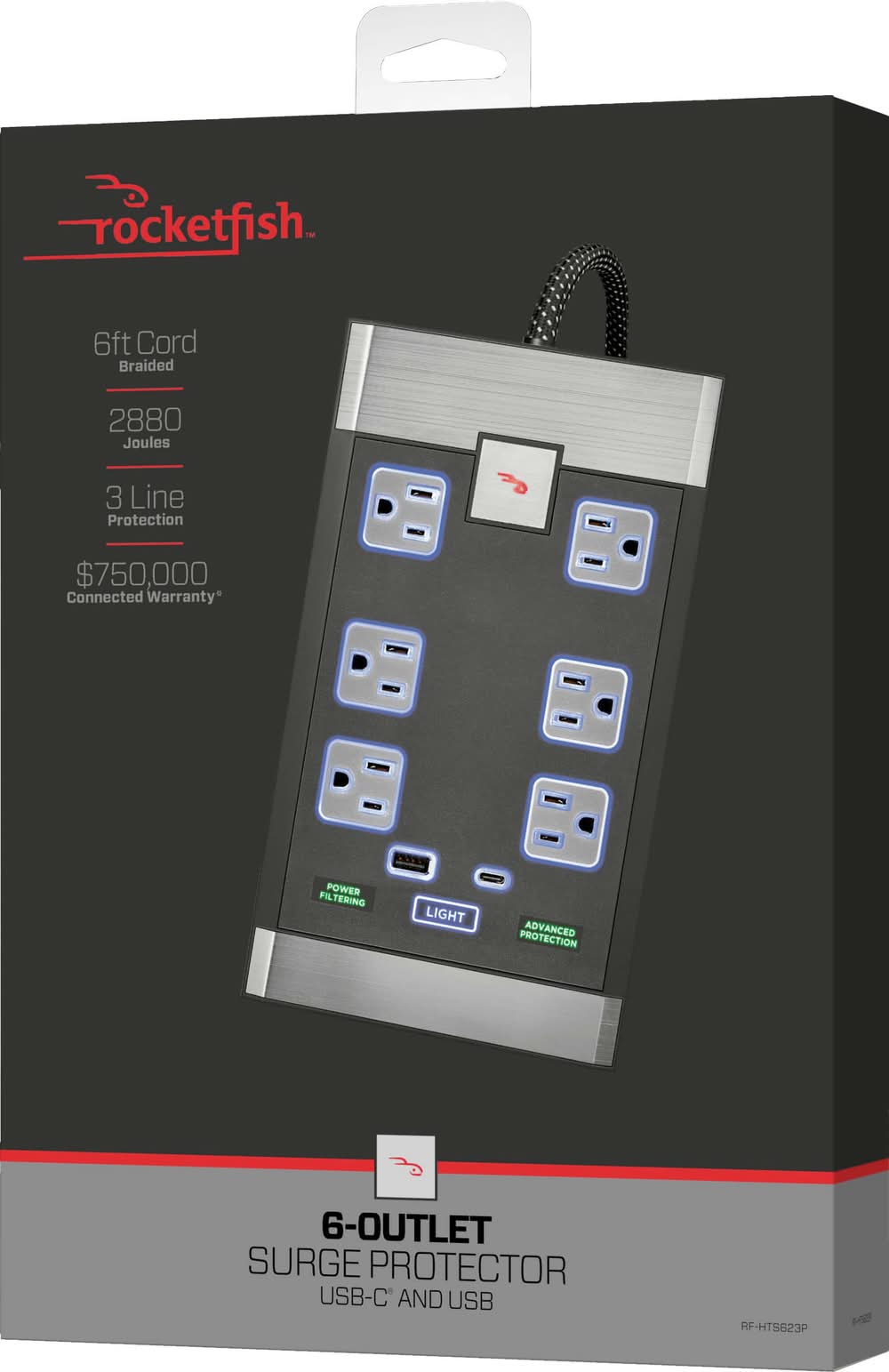 Stay protected from a power spike with the Rocketfish 6-Outlet/1-USB-C/1-USB 2,880 Joules Surge Protector. It absorbs power surges up to 2,880 joules, keeping your devices safely connected. A USB-C port and USB port efficiently charge your mobile devices with 32 total watts. This surge protector also combines the best of both worlds with four standard-spaced and two wide-spaced outlets to connect wall chargers and other devices. Finally, it includes 3-line protection and status LED lights, so you know your devices are being protected from surges that can enter all three lines. Color: Black