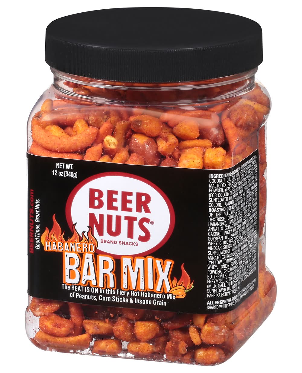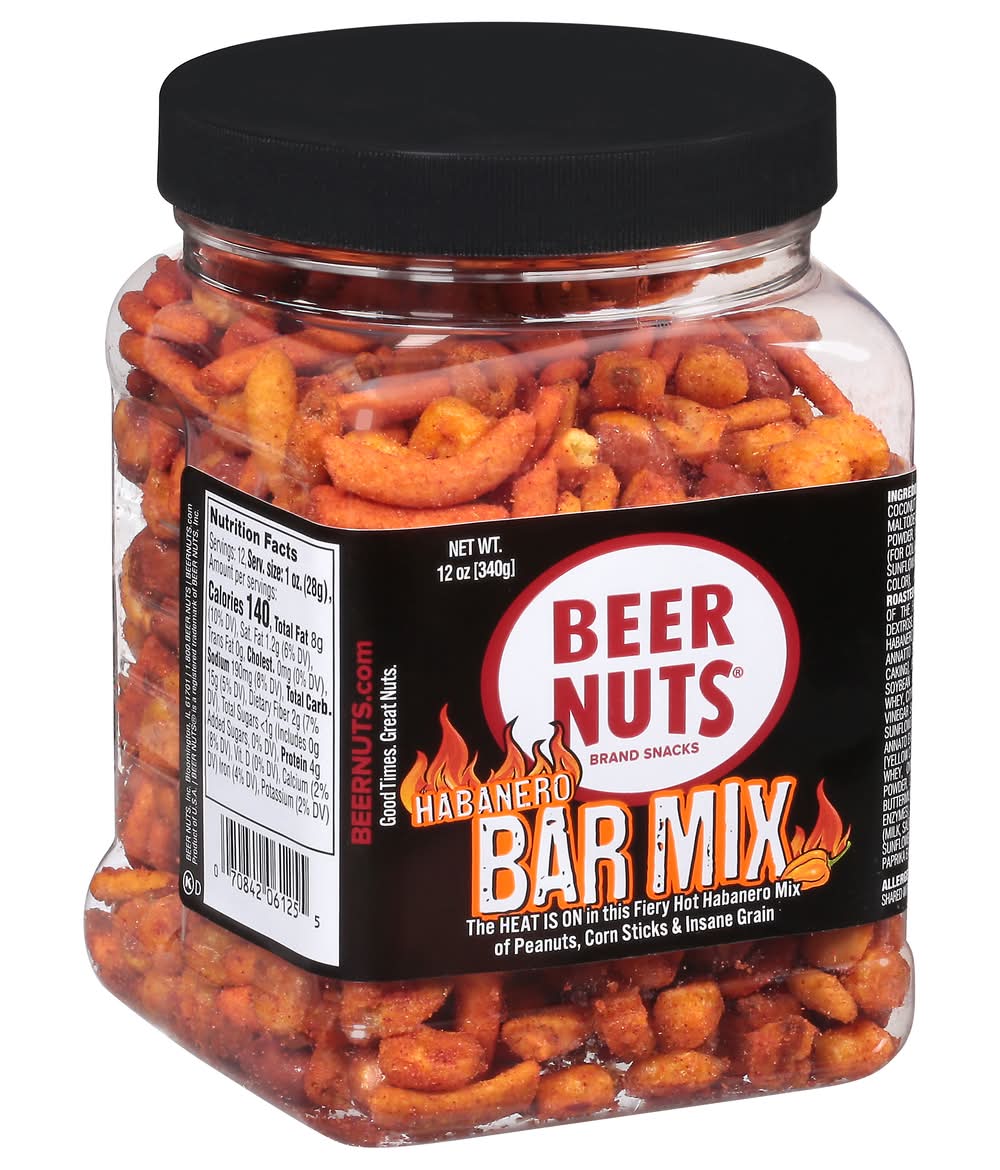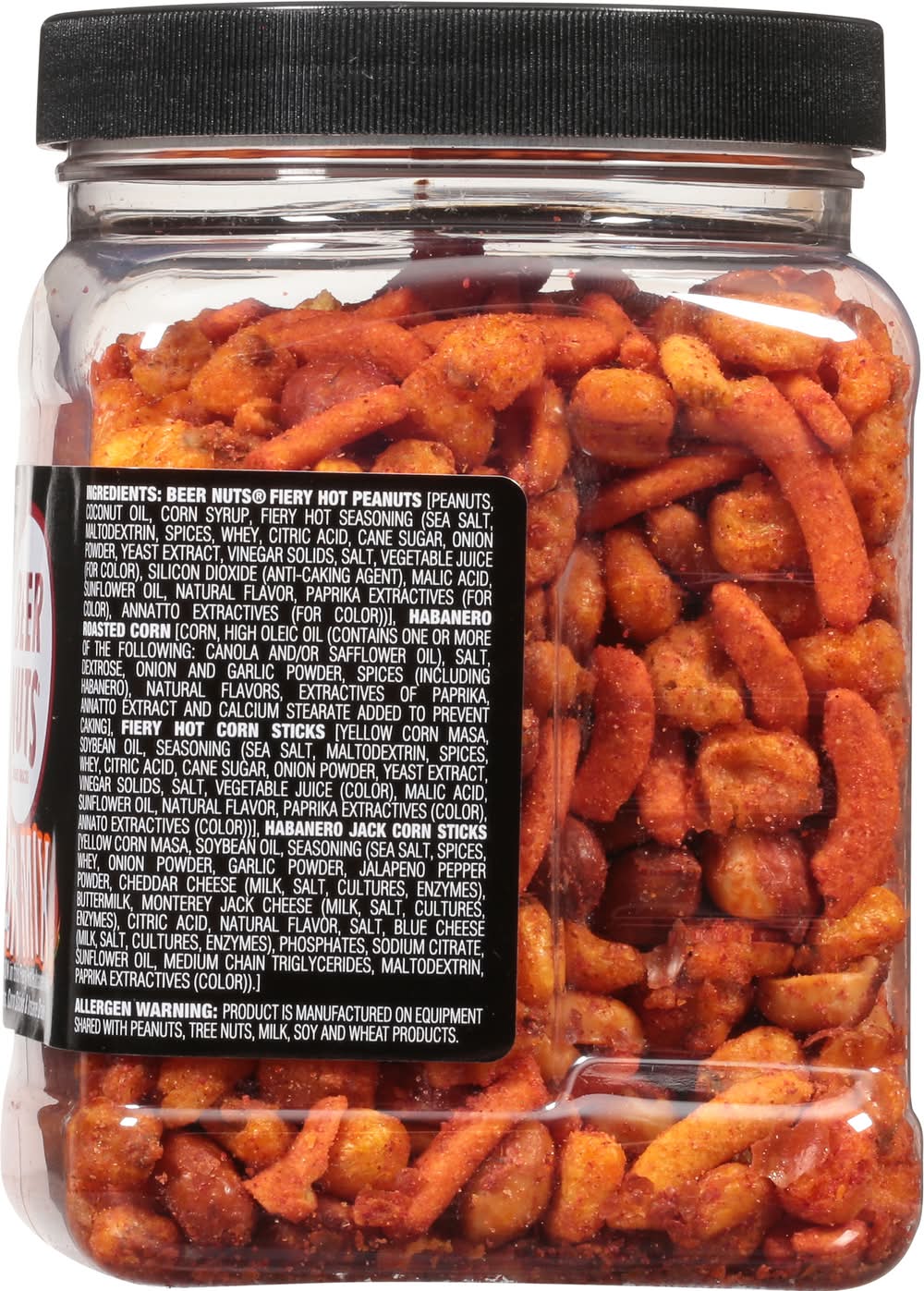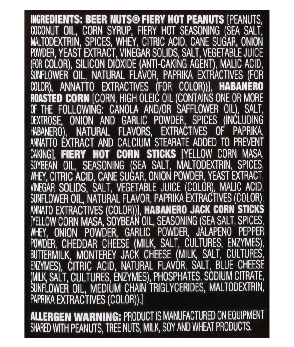 Ingredients: Beer Nuts Fiery Hot Peanuts [Peanuts, Coconut Oil, Corn Syrup, Fiery Hot Seasoning (Sea Salt, Maltodextrin, Spices, Whey, Citric Acid, Cane Sugar, Onion Powder, Yeast Extract, Vinegar Solids, Salt, Vegetable Juice (for Color), Silicon Dioxide (Anti-Caking Agent), Malic Acid, Sunflower Oil, Natural Flavor, Paprika Extractives (for Color), Annatto Extractives (for Color))], Habanero Roasted Corn [Corn, High Oleic Oil (Contains One or More of the Following: Canola and/or Safflower Oil), Salt, Dextrose, Onion and Garlic Powder, Spices (Including Habanero), Natural Flavors, Extractives of Paprika, Annatto Extract and Calcium Stearate Added to Prevent Caking], Fiery Hot Corn Sticks [Yellow Corn Masa, Soybean Oil, Seasoning (Sea Salt, Maltodextrin, Spices, Whey, Citric Acid, Cane Sugar, Onion Powder, Yeast Extract, Vinegar Solids, Salt, Vegetable Juice (Color), Malic Acid, Sunflower Oil, Natural Flavor, Paprika Extractives (Color), Annato Extractives (Color))], Habanero Jack Corn Sticks [Yellow Corn Masa, Soybean Oil, Seasoning (Sea Salt, Spices, Whey, Onion Powder, Garlic Powder, Jalapeno Pepper Powder, Cheddar Cheese (Milk, Salt, Cultures, Enzymes), Buttermilk, Monterey Jack Cheese (Milk, Salt, Cultures, Enzymes), Citric Acid, Natural Flavor, Salt, Blue Cheese (Milk, Salt, Cultures, Enzymes), Phosphates, Sodium Citrate, Sunflower Oil, Medium Chain Triglycerides, Maltodextrin, Paprika Extractives (Color)).] Contains: Peanuts, Soybeans, Milk, Peanuts, Tree Nuts, Milk, Soybeans, Wheat