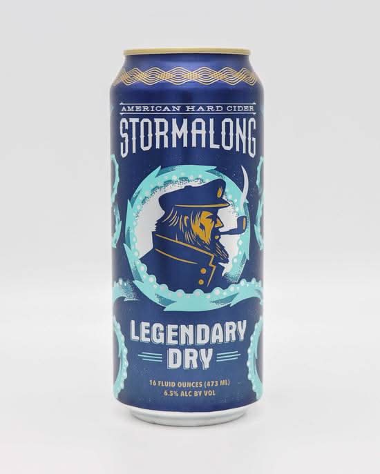 Stormalong Cider Legendary Dry is a flagship cider characterized by its crisp and champagne-like profile, containing less than 3 grams of sugar in each 16oz can. Alcohol by volume: 6%