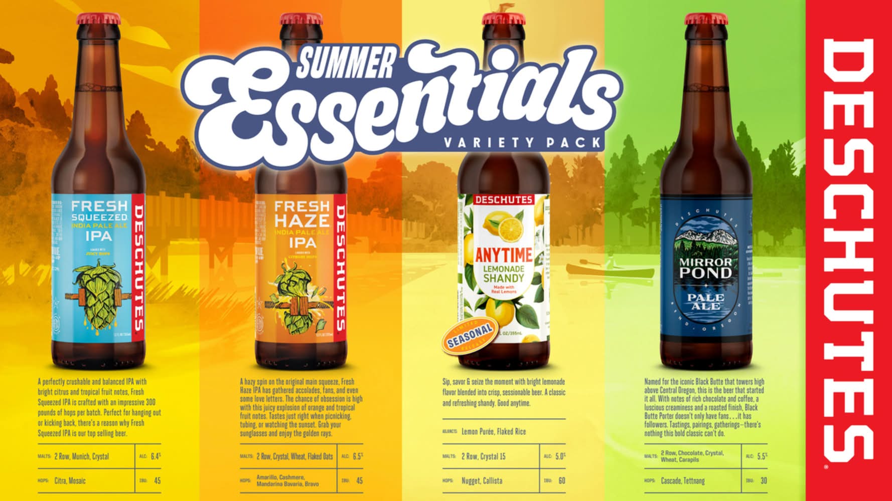 This pack makes shopping for "just the essentials" a breeze. The Summer Essentials Variety Pack features Deschutes Brewery classics that are amongst our most-requested beers: Fresh Squeezed IPA, Fresh Haze IPA, Mirror Pond Pale Ale, and Anytime Lemonade Shandy. They're so beloved that if you share these beers with a friend there is a 90% chance they'll tell you a story about the beer in their hand. This is a variety pack for the fans, for beer lovers who crave variety and quality with every sip of each unique style. • Brand: Deschutes brewery • Pack size: 12 • Alcohol by volume: 6.4% • Deschutes Brewery, Bend, OR, 97702