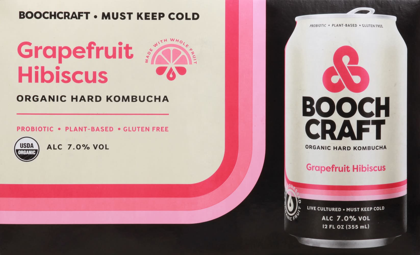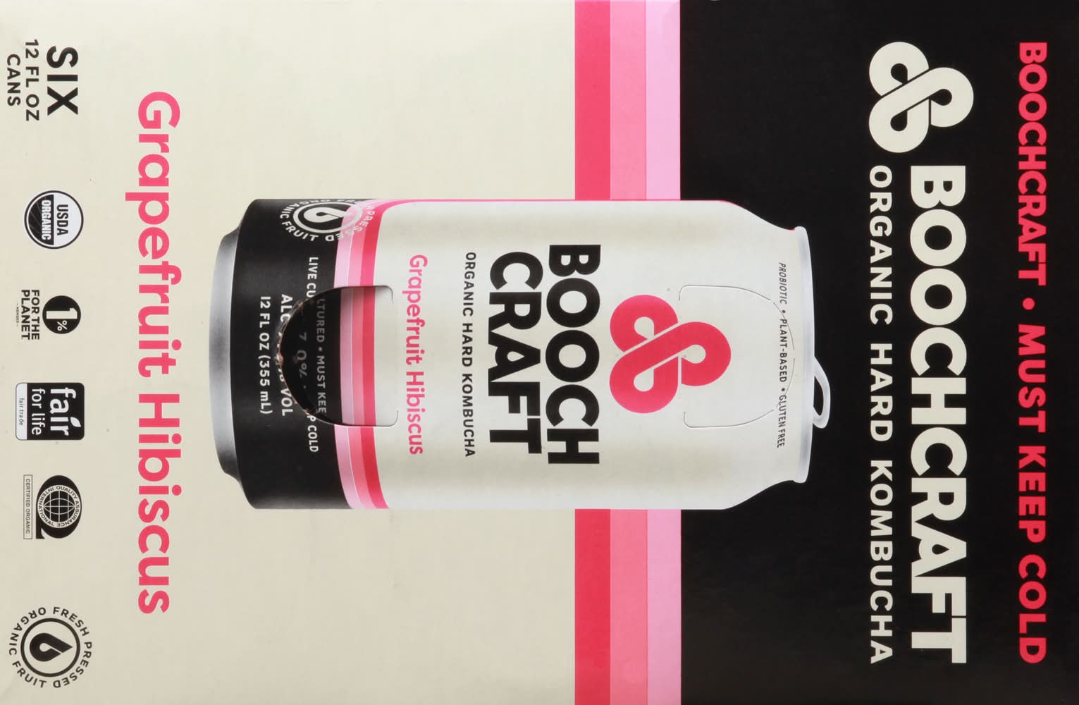 Uncompromised. Boochcraft is a brewery, a juicery, and most importantly, a Boochery. We make organic hard kombucha fermented black tea with fresh-pressed fruit - for our fellow idealists and optimists who give a damn about doing better. Real is radical: whole ingredients. No shortcuts, and no fake stuff. That is what uncompromised tastes like. Unsolicited life advice Boochcraft core value No. 1: be bold. Innovation takes big ideas, and big ideas take courage. Think big. Speak your mind, and don't be afraid to fail occasionally. • Brand: Boochcraft • Flavor: Grapefruit-hibiscus • Pack size: 6 • gluten-free, organic • Alcohol by volume: 7% • Number of servings: 6