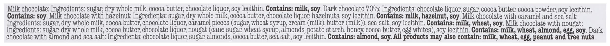 Ingredients: Milk Chocolate: Sugar, Dry Whole Milk, Cocoa Butter, Chocolate Liquor, Soy Lecithin. Milk Chocolate Caramel Sea Salt: Sugar, Dry Whole Milk, Cocoa Butter, Chocolate Liquor, Caramel Pieces (Sugar, Wheat Syrup, Cream (Milk), Butter (Milk)), Sea Salt, Soy Lecithin. Milk Chocolate Nougat: Sugar, Dry Whole Milk, Cocoa Butter, Chocolate Liquor, Nougat (Cane Sugar, Wheat Syrup, Almonds, Potato Starch, Honey, Cocoa Butter, Egg Whites), Soy Lecithin. Dark Chocolate Almond Sea Salt: Chocolate Liquor, Sugar, Almonds, Cocoa Butter, Sea Salt, Soy Lecithin. Milk Chocolate Hazelnut: Sugar, Dry Whole Milk, Cocoa Butter, Chocolate Liquor, Hazelnuts, Soy Lecithin. Dark Chocolate 70%: Chocolate Liquor, Sugar, Cocoa Butter, Cocoa Powder, Soy Lecithin. Contains: Milk, Soybeans, Wheat, Tree Nuts, Almonds, Eggs, Tree Nuts, Hazelnuts/Filberts, Milk, Wheat, Eggs, Peanuts, Tree Nuts