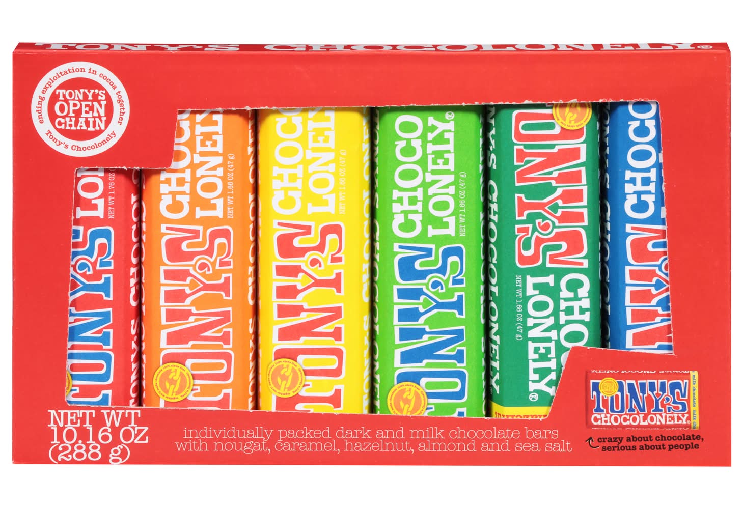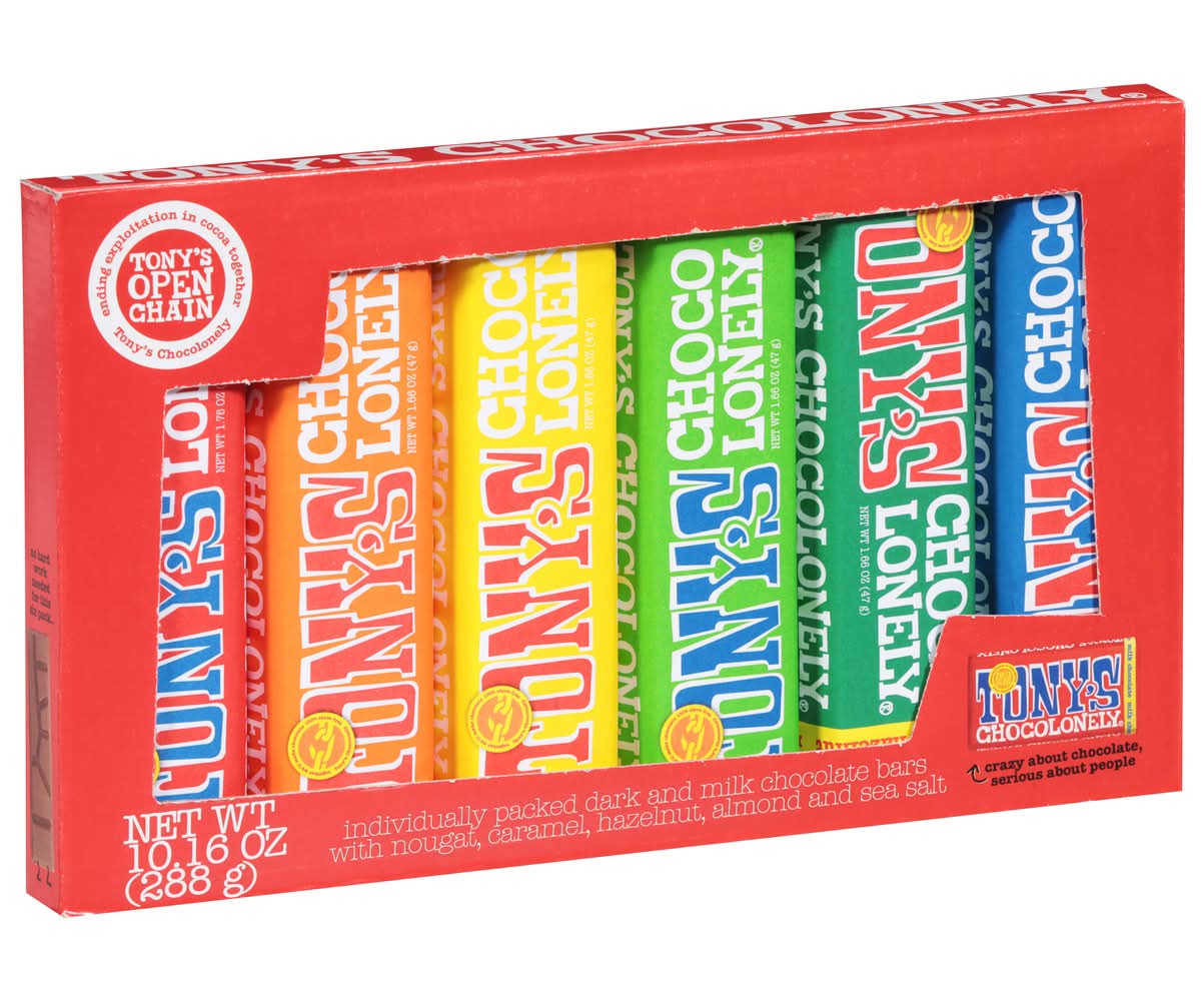Try some of our favorite Tony's Chocolonely flavors all in one convenient pack! Look no further for a perfect gift for Valentine's Day, Easter, Mother's Day, and every day in between. • Brand: Tony's chocolonely • Flavor: Caramel-nougat-hazelnut-almond-sea salt