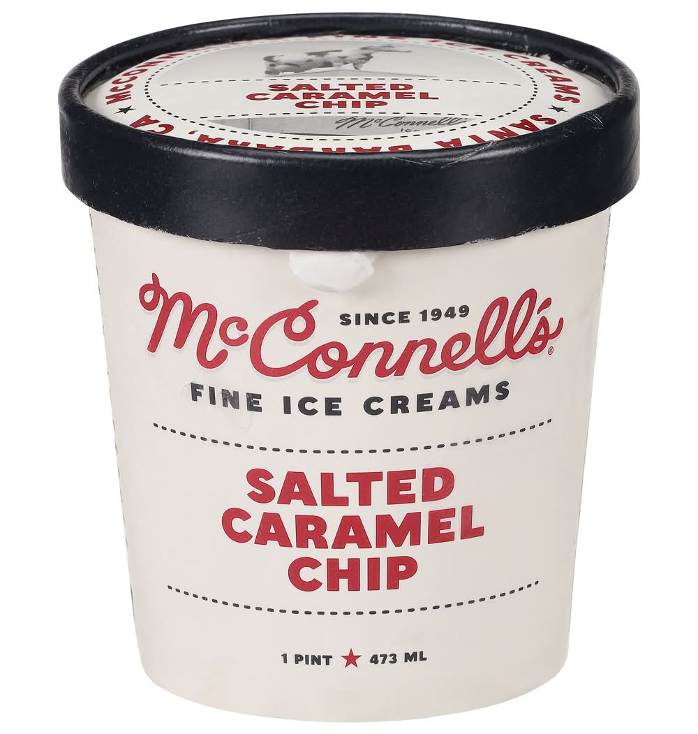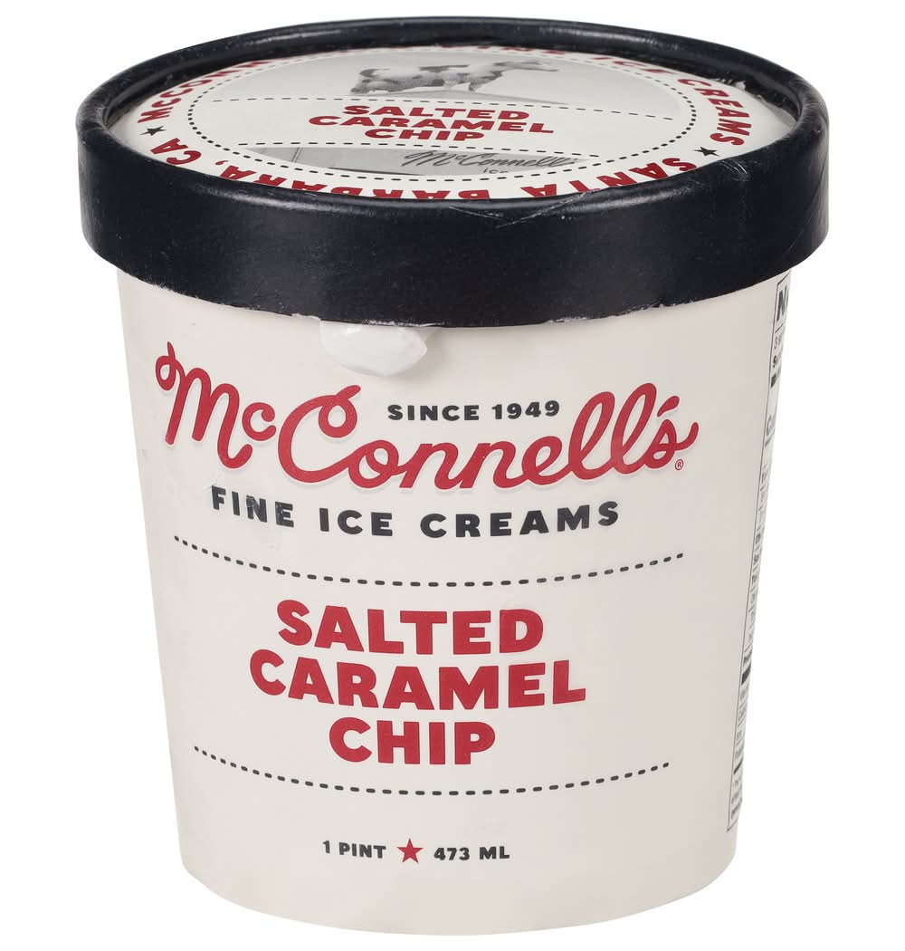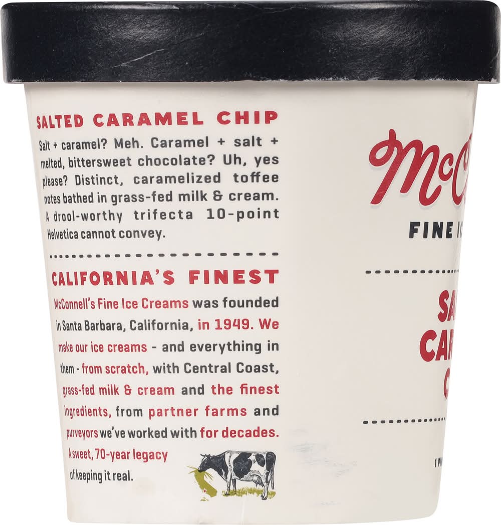 Gluten free. Since 1949. Salted Caramel Chip: Salt + caramel? Meh. Caramel + salt + malted, bittersweet chocolate? Uh, yes please? Distinct, caramelized toffee notes bathed in grass-fed milk & cream. A drool-worthy trifecta 10-point Halvetica cannot convey. California's Finest: McConell's Fine Ice Creams was founded in Santa Barbara, California, in 1949. We make our ice creams - and everything in them - from scratch, with Central Coast, grass-fed milk & cream and the finest ingredients, from partner farms and purveyors we've worked with for decades. • Brand: Mcconnell's • Flavor: Salted caramel chip • gluten-free, kosher • McConnell's Fine Ice Creams, OxnardCA 93030