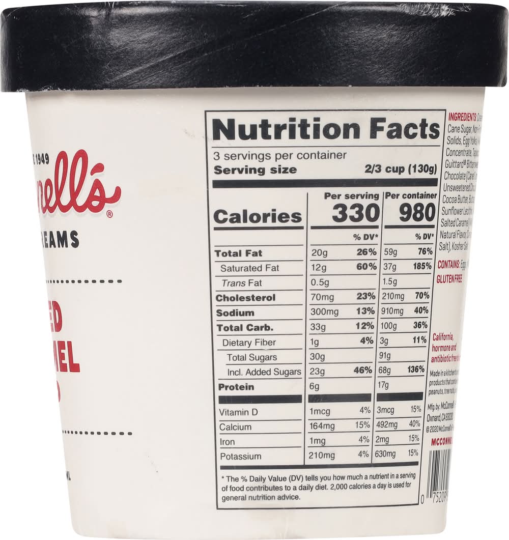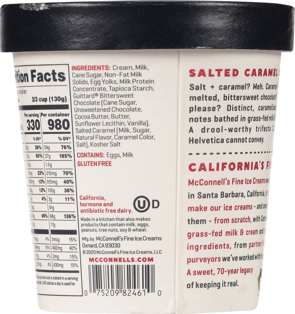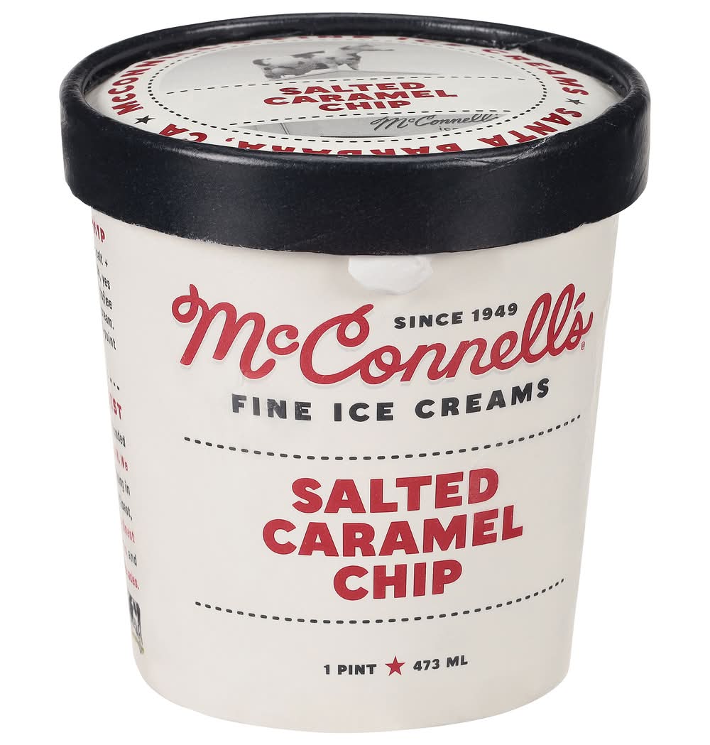 Gluten free. Since 1949. Salted Caramel Chip: Salt + caramel? Meh. Caramel + salt + malted, bittersweet chocolate? Uh, yes please? Distinct, caramelized toffee notes bathed in grass-fed milk & cream. A drool-worthy trifecta 10-point Halvetica cannot convey. California's Finest: McConell's Fine Ice Creams was founded in Santa Barbara, California, in 1949. We make our ice creams - and everything in them - from scratch, with Central Coast, grass-fed milk & cream and the finest ingredients, from partner farms and purveyors we've worked with for decades. • Brand: Mcconnell's • Flavor: Salted caramel chip • gluten-free, kosher • McConnell's Fine Ice Creams, OxnardCA 93030