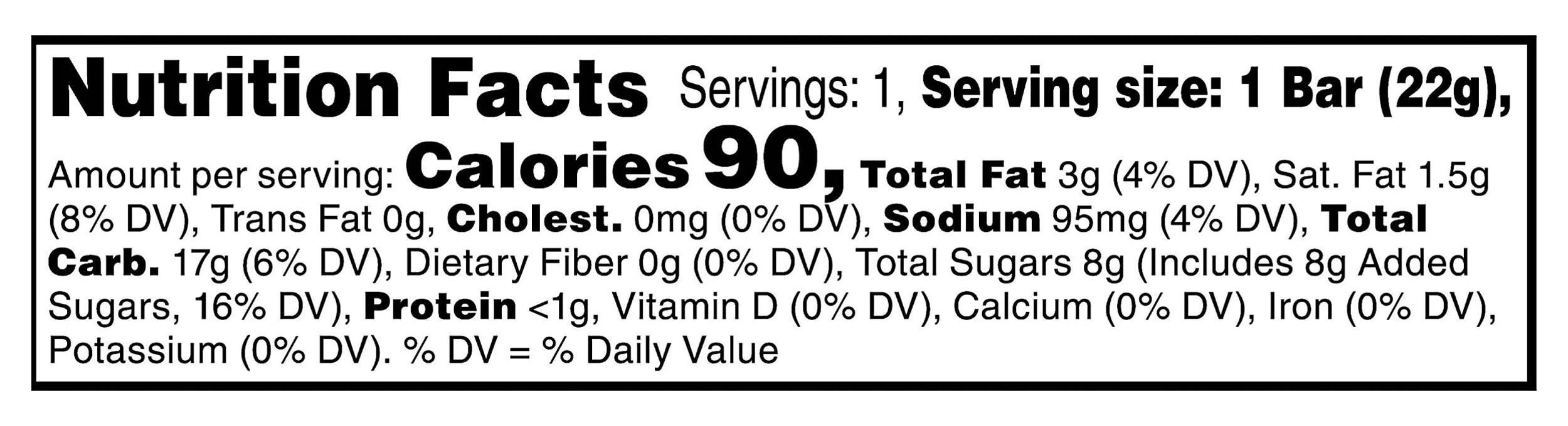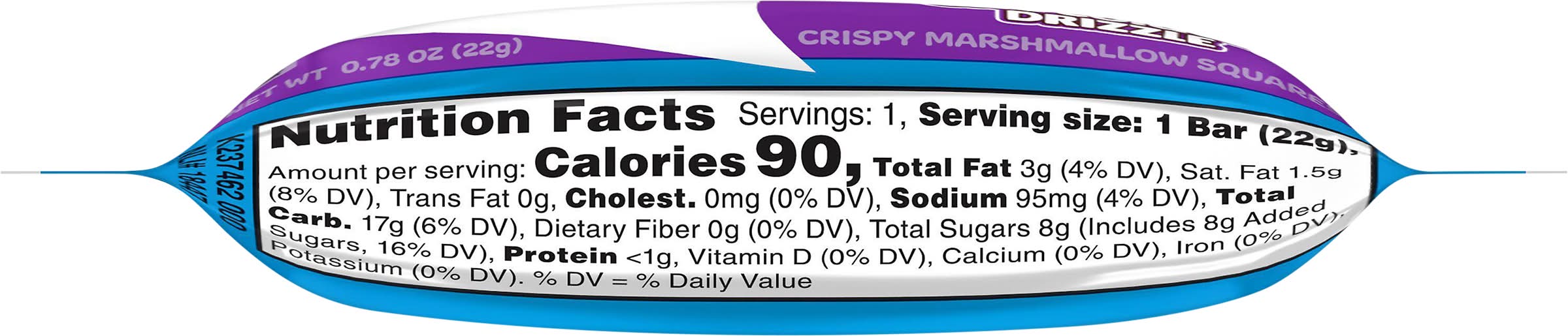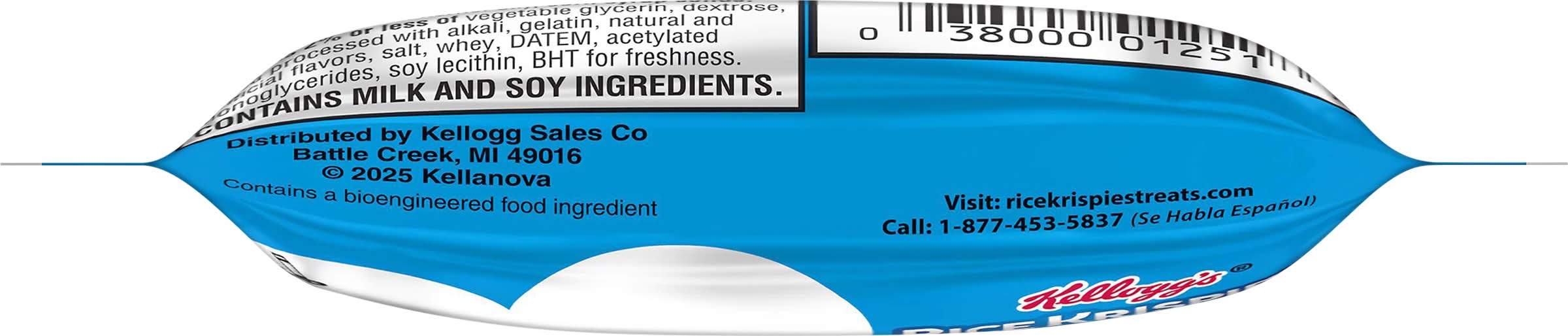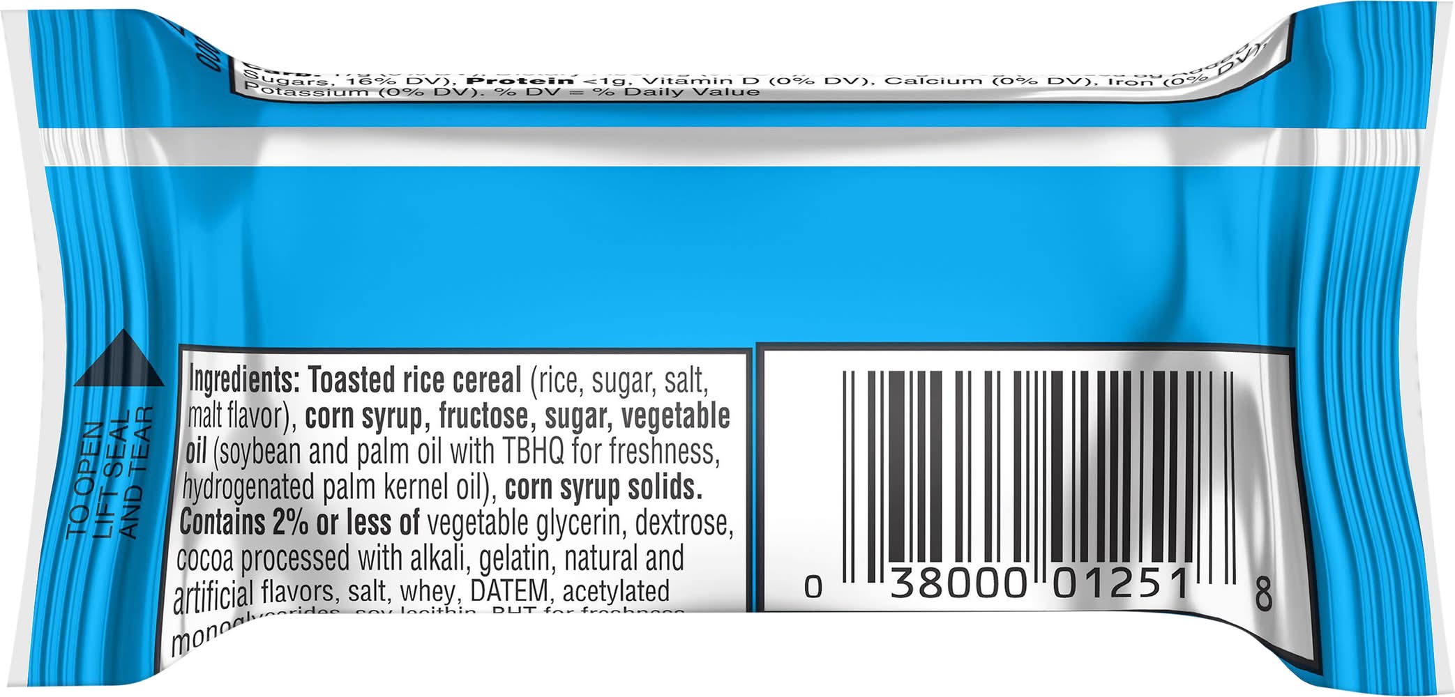 Ingredients: Toasted Rice Cereal (Rice, Sugar, Salt, Malt Flavor), Corn Syrup, Fructose, Sugar, Vegetable Oil (Soybean and Palm Oil with TBHQ for Freshness, Hydrogenated Palm Kernel Oil), Corn Syrup Solids, Contains 2% or Less of Vegetable Glycerin, Dextrose, Cocoa Processed with Alkali, Gelatin, Natural and Artificial Flavors, Salt, Whey, DATEM, Acetylated Monoglycerides, Soy Lecithin, BHT for Freshness Contains: Milk, Soybeans