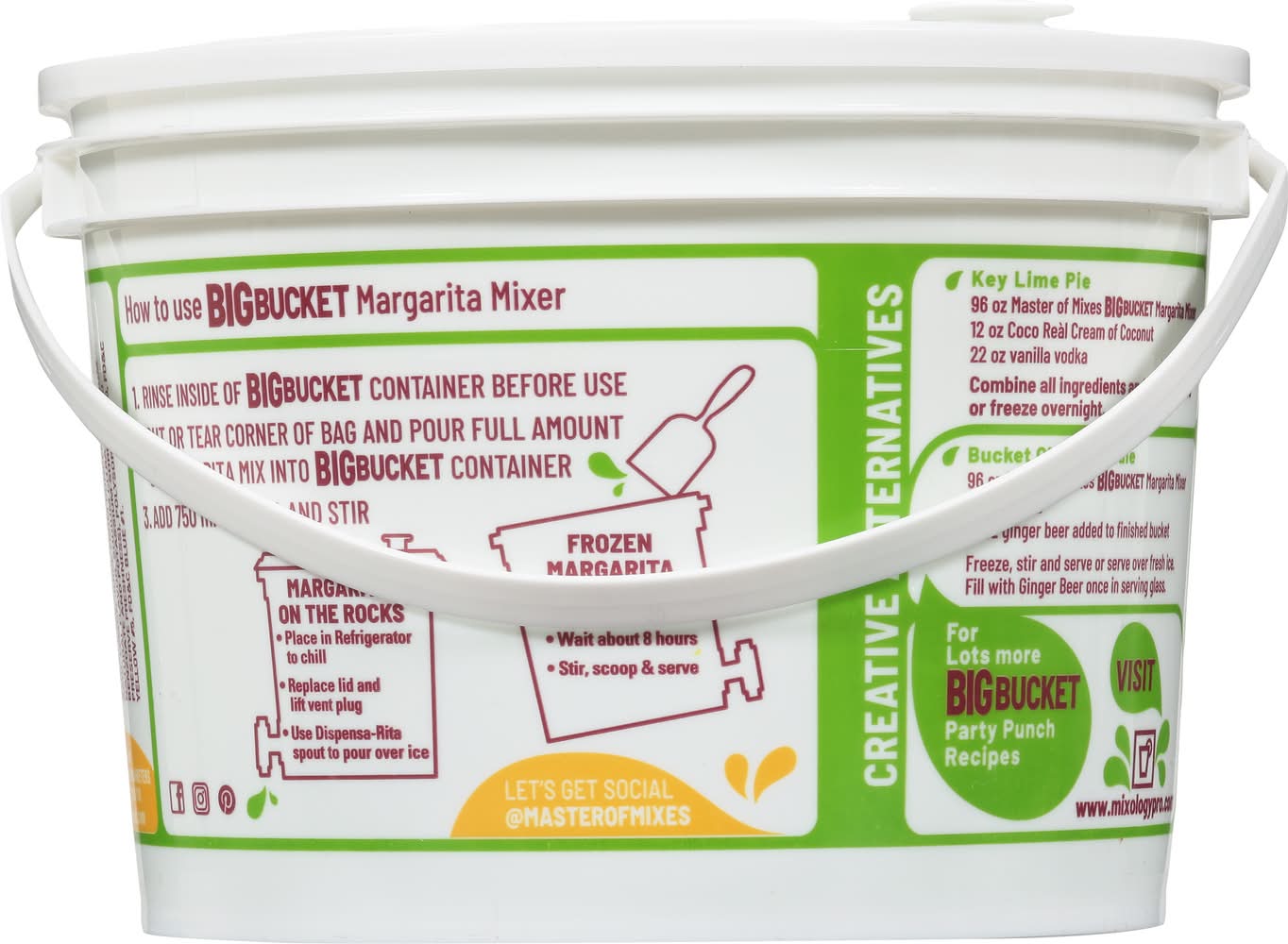 How to use bigbucket margarita mixer: 1. rinse inside bigbucket container before use. 2. cut or tear corner of bag and pour full amount of margarita mix into bigbucket container. add 750 ml tequila and stir. replace lid and left vent plug. margarita on the rocks: place in refrigerator to chill. use dispensa-rita spout to pour over ice. frozen margaritas: wait about 8 hours. stir, scoop & serve.