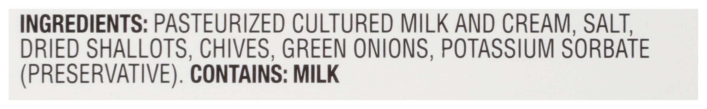 Ingredients: Pasteurized Cultured Milk and Cream, Salt, Dried Shallots, Chives, Green Onions, Potassium Sorbate (Preservative) Contains: Milk