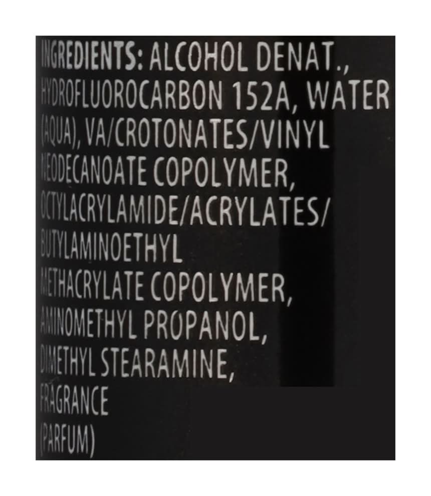 Ingredients: SD ALCOHOL 40-B (ALCOHOL DENAT.), HYDROFLUOROCARBON 152A, VA/CROTONATES/VINYLNEODECANOATE COPOLYMER, OCTYLACRYLAMIDE/ACRYLATES/BUTYLAMINOETHYL METHACRYLATE COPOLYMER, AMINOMETHYL PROPANOL, DIMETHYLSTEARAMINE, FRAGRANCE (PARFUM).