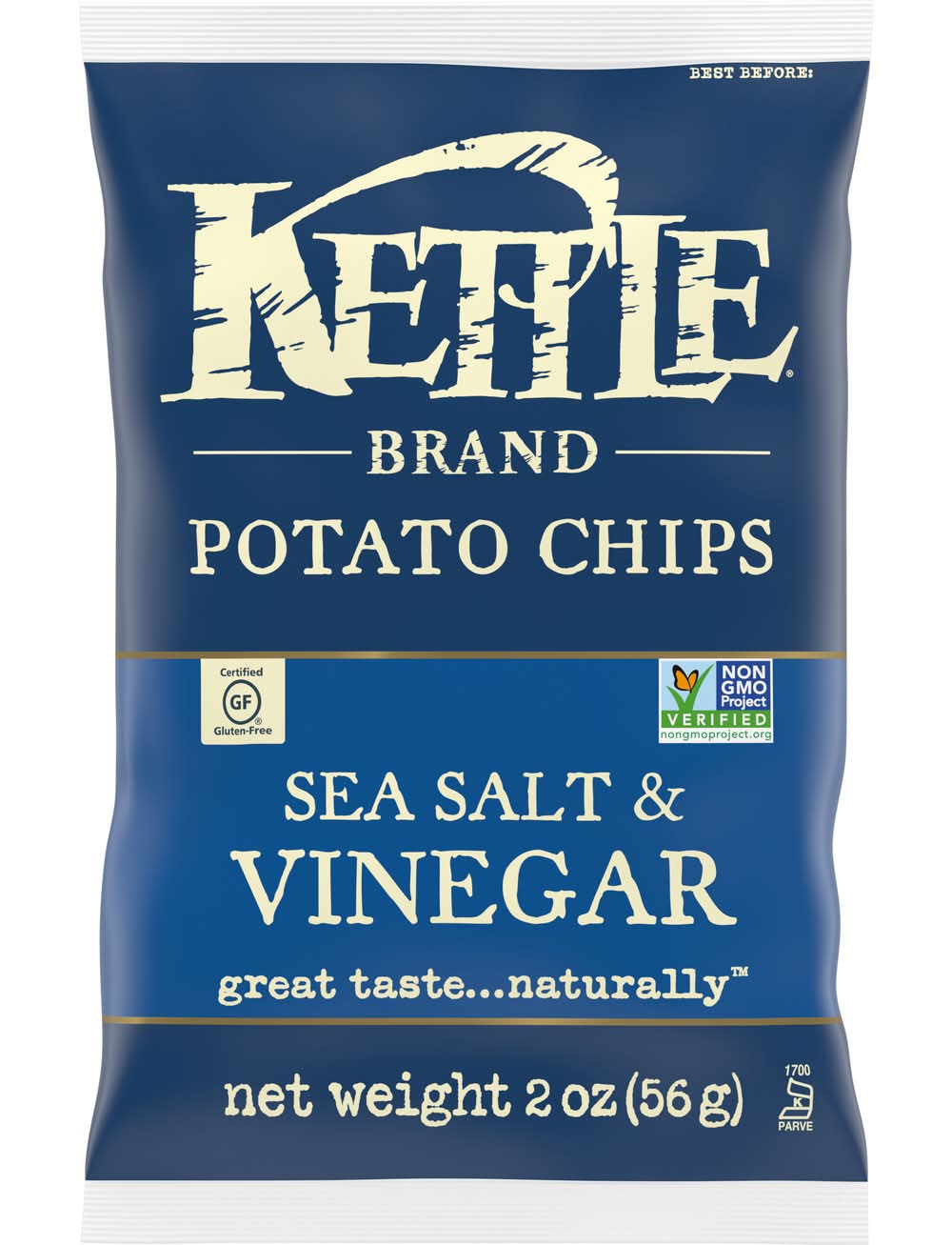 Kettle Brand Salt & Vinegar kettle cooked chips start with a search for undisputed potato excellence. Determined not to disrupt the flawless, spudsy goodness, these beauties are kettle cooked, skins on, one small batch at a time. Delight your taste buds with our take on this flavorful favorite with a balance of sea salt with a hint of tongue-puckering vinegar. And of course, these chips come complete with the satisfying crunch you love. When you open a bag of our Kettle Brand potato chips, you know you're getting incredible kettle chips made with authentic recipes by real people. From their farms to our kitchens and then to your home, the time and attention every Kettle Brand worker puts into their products is care you can trust. All that, plus Kettle Brand chips deliver a delicious snack that’s non-GMO Project Verified, and Certified Gluten-Free. These 2-ounce snack bags of kettle chips are great at home or on-the-go. Kettle Brand potato chips. Extra in a good way. Number of servings: 1