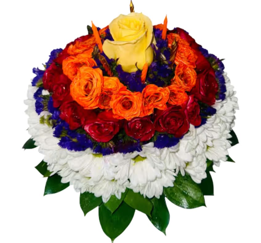 Bright and festive, this unique floral arrangement is crafted in the shape of a cake, symbolizing joy and celebration. Layers of colorful blooms yellow, orange, red, and white create a stunning visual harmony. Perfect for birthdays, anniversaries, or cheerful surprises, this creative design brings the beauty of flowers to any special occasion.