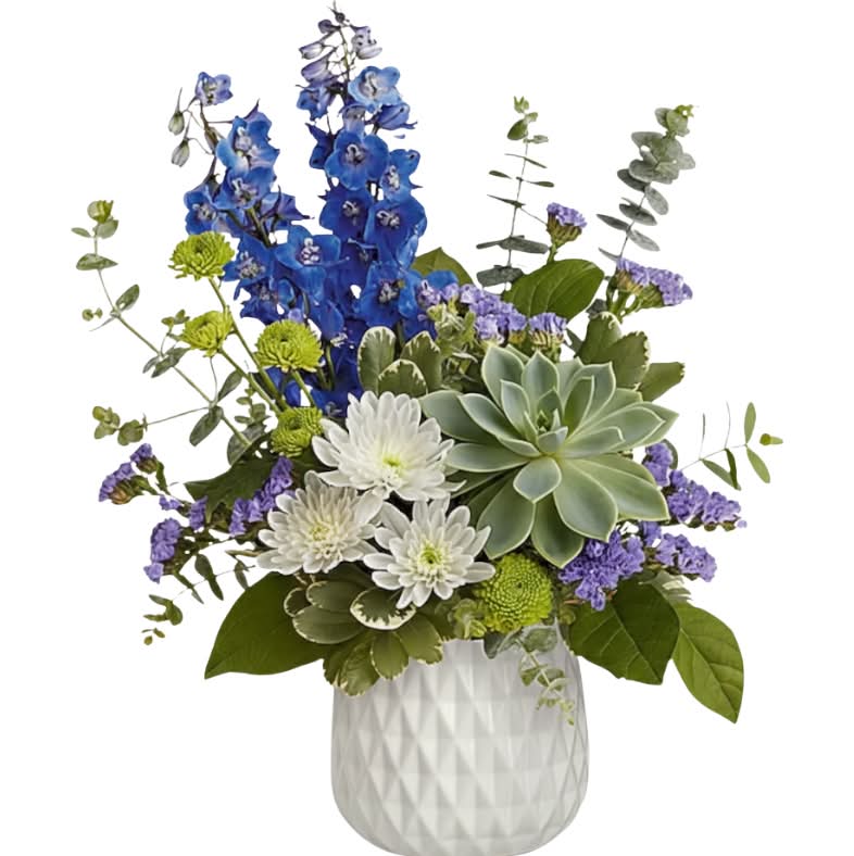 Mod Magnifique Bouquet (Succulent, Blue Delphiniums, White Chrysanthemums, Green Hydrangea Accents, Lavender Flowers, Eucalyptus in a White Textured Vase)