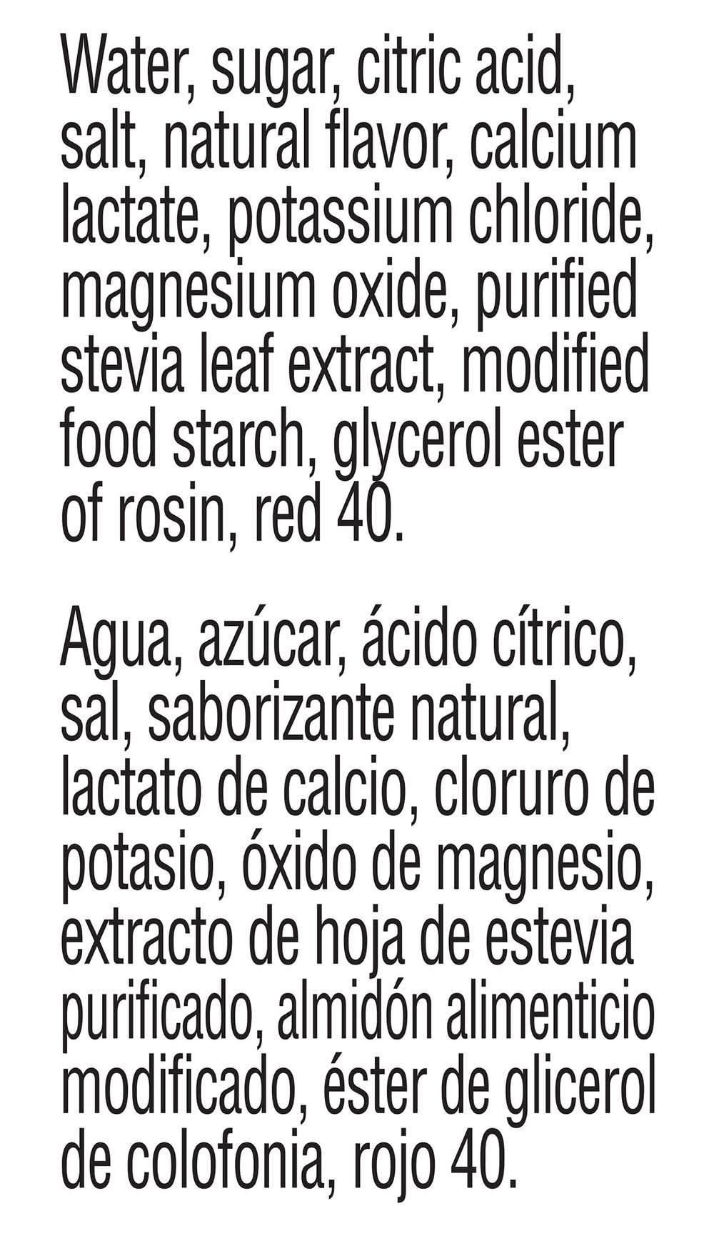 Ingredients: Water, Sugar, Citric Acid, Salt, Natural Flavor, Calcium Lactate, Potassium Chloride, Magnesium Oxide, Purified Stevia Leaf Extract, Modified Food Starch, Glycerol Ester of Rosin, Red 40